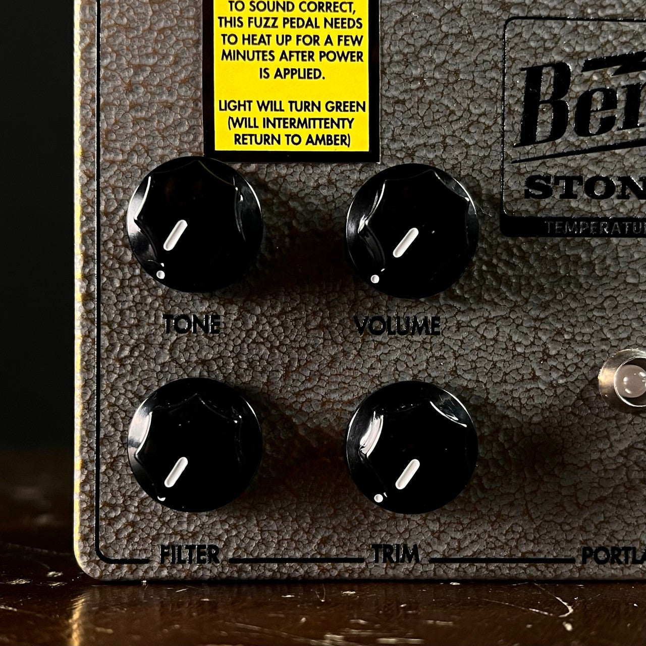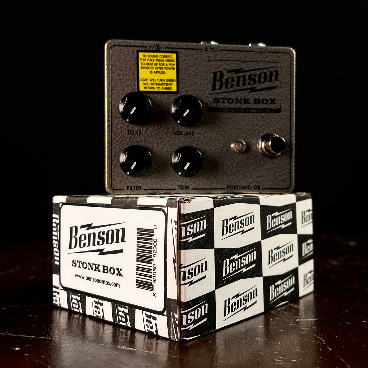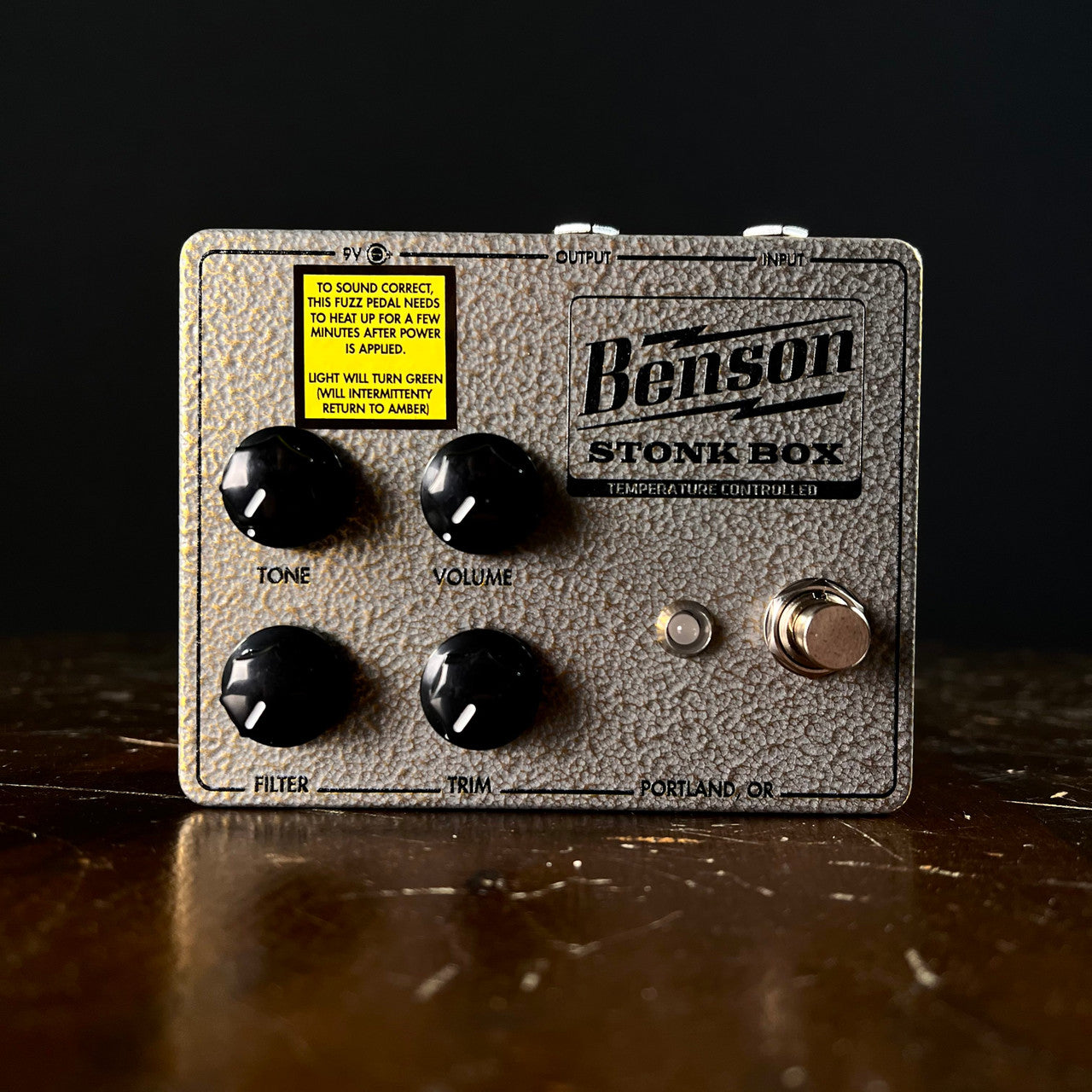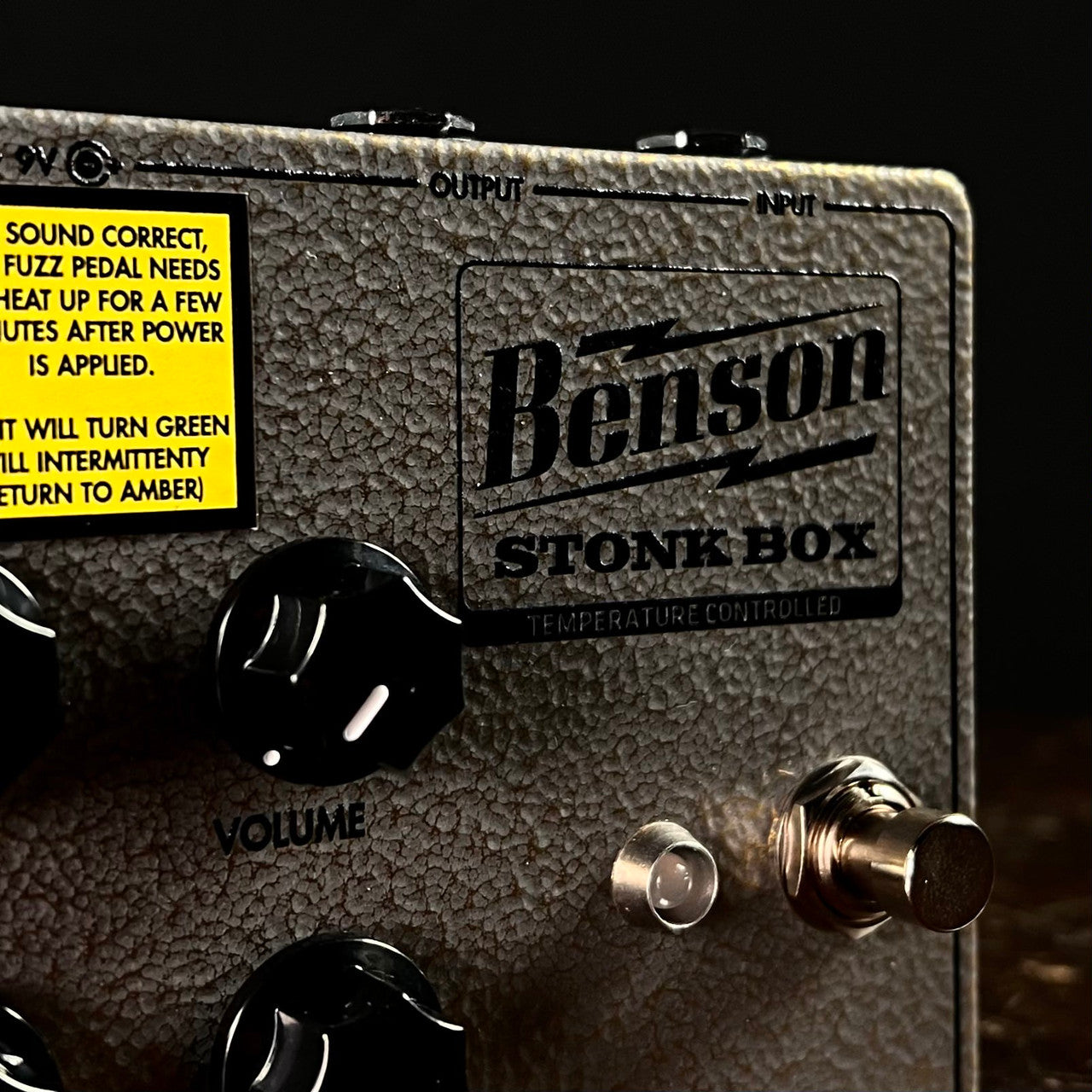 The Benson Amps Stonk Box Fuzz Pedal is our second Automatic Thermally Bias fuzz pedal, so after plugging it into power (9vdc only), it will take 2-3 minutes on average to sound correct. The color of the LED indicator light might change. Don’t turn the internal trimmer. THAT’S IT. Read on if you would like to...there’s some good stuff.