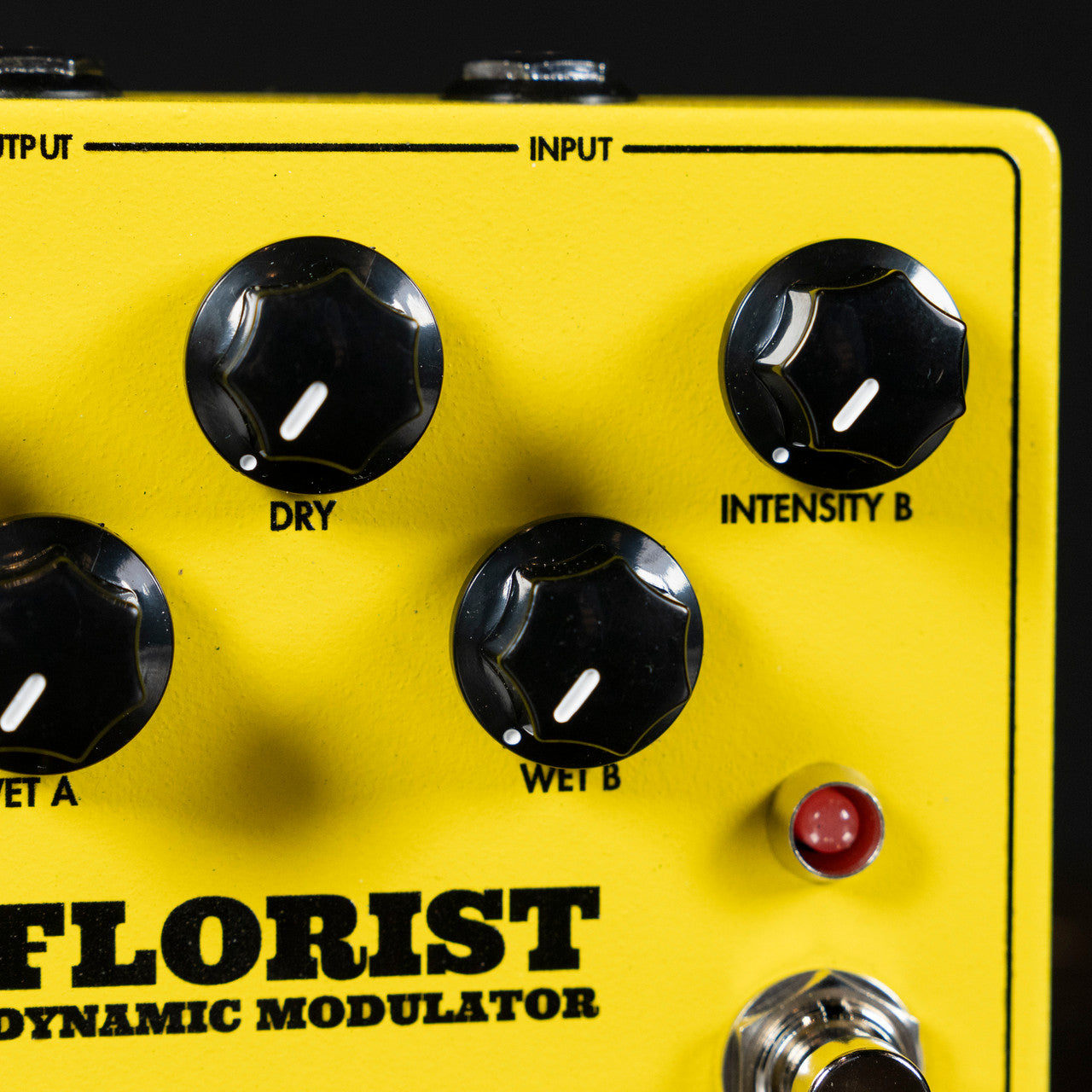 While the Florist starts with the core idea of the Slow Loris, it is something else entirely and is not a revision or modification of the original. For instance, the delay range on the Florist is way faster than the original. We also redesigned the signal path for higher fidelity and use a compressor type detector circuit for controlling the delay speed. We add a second delay channel using its own different detector to try to achieve some through-zero flanging and tri-chorus sounds. The two wet signals and the dry signal have independent volume control (DRY, WET A, and WET B) to blend the signals together. The two wet signals have independent intensity controls (INTENSITY A and INTENSITY B) corresponding to the respective volume controls.