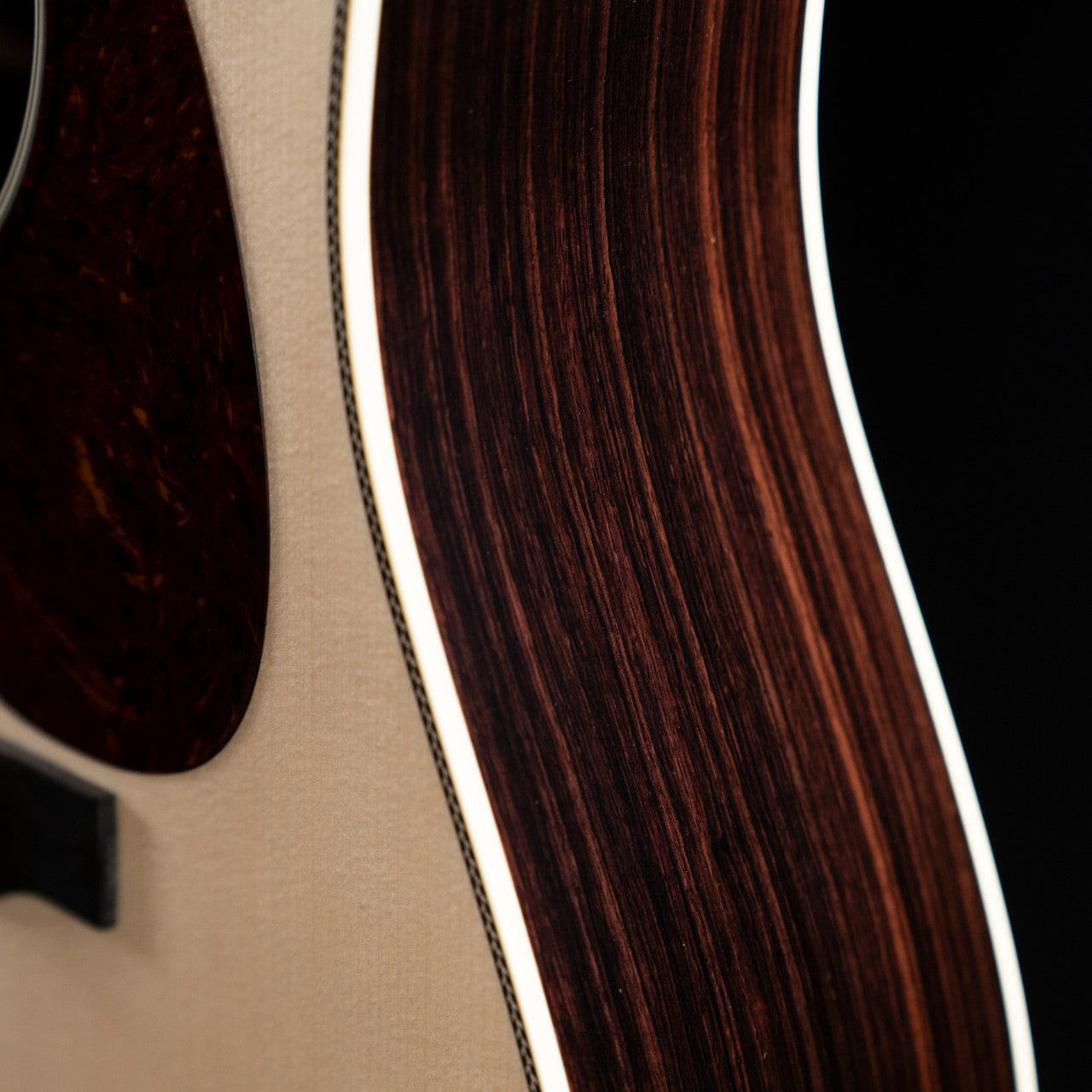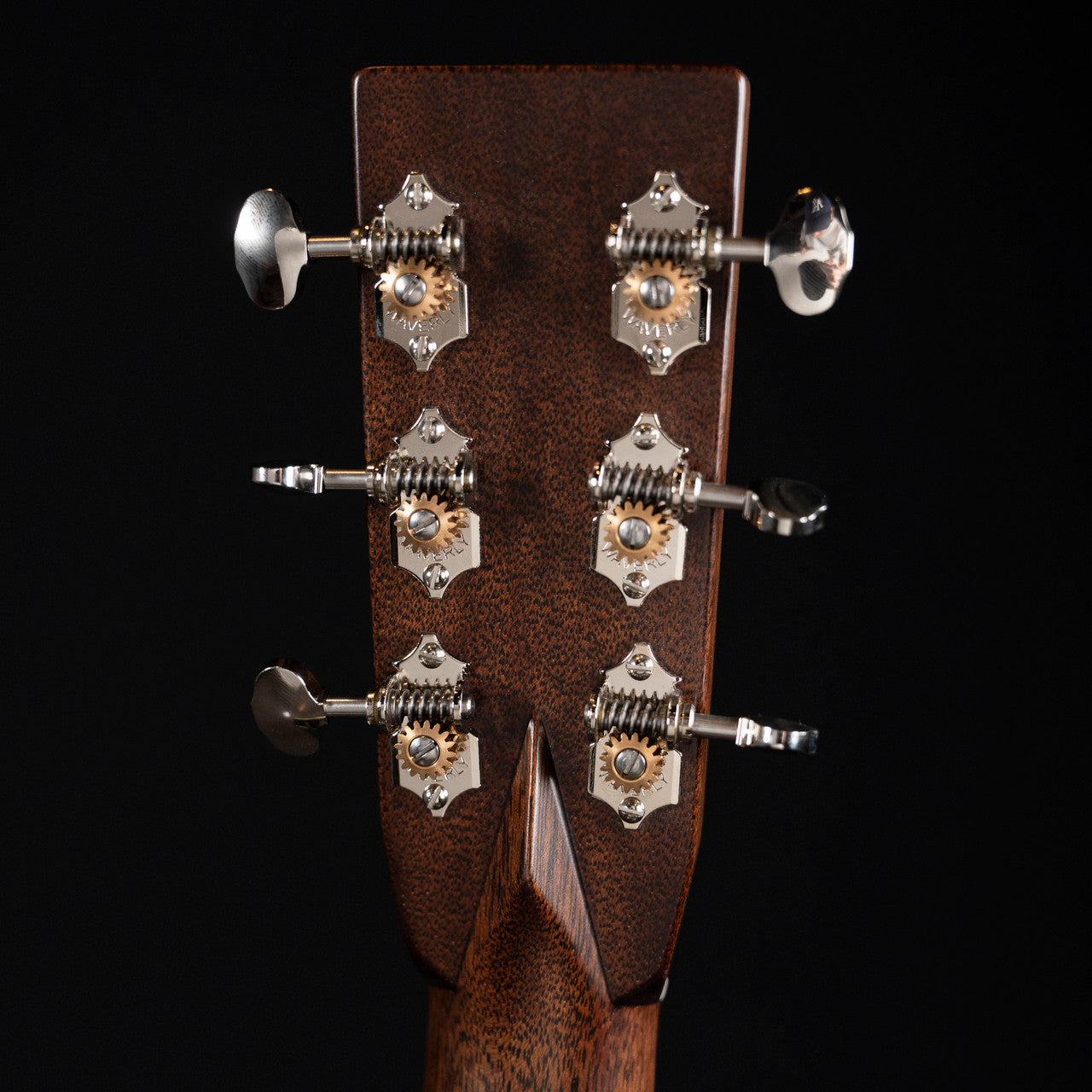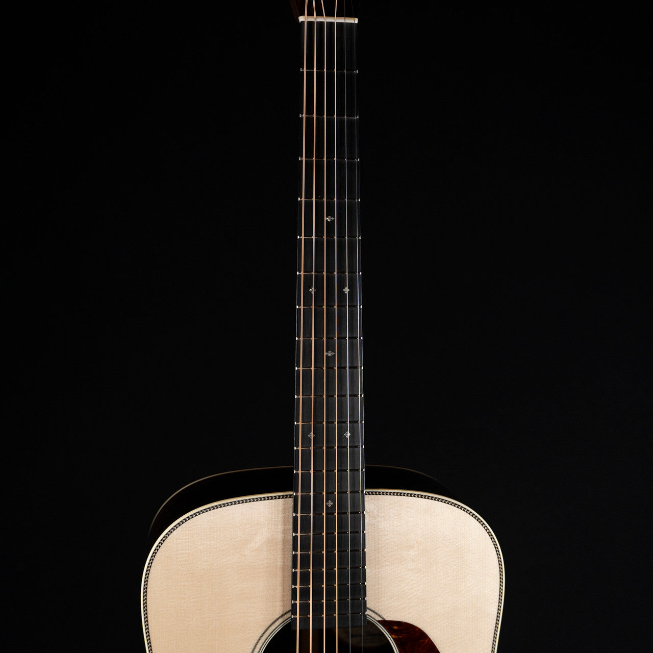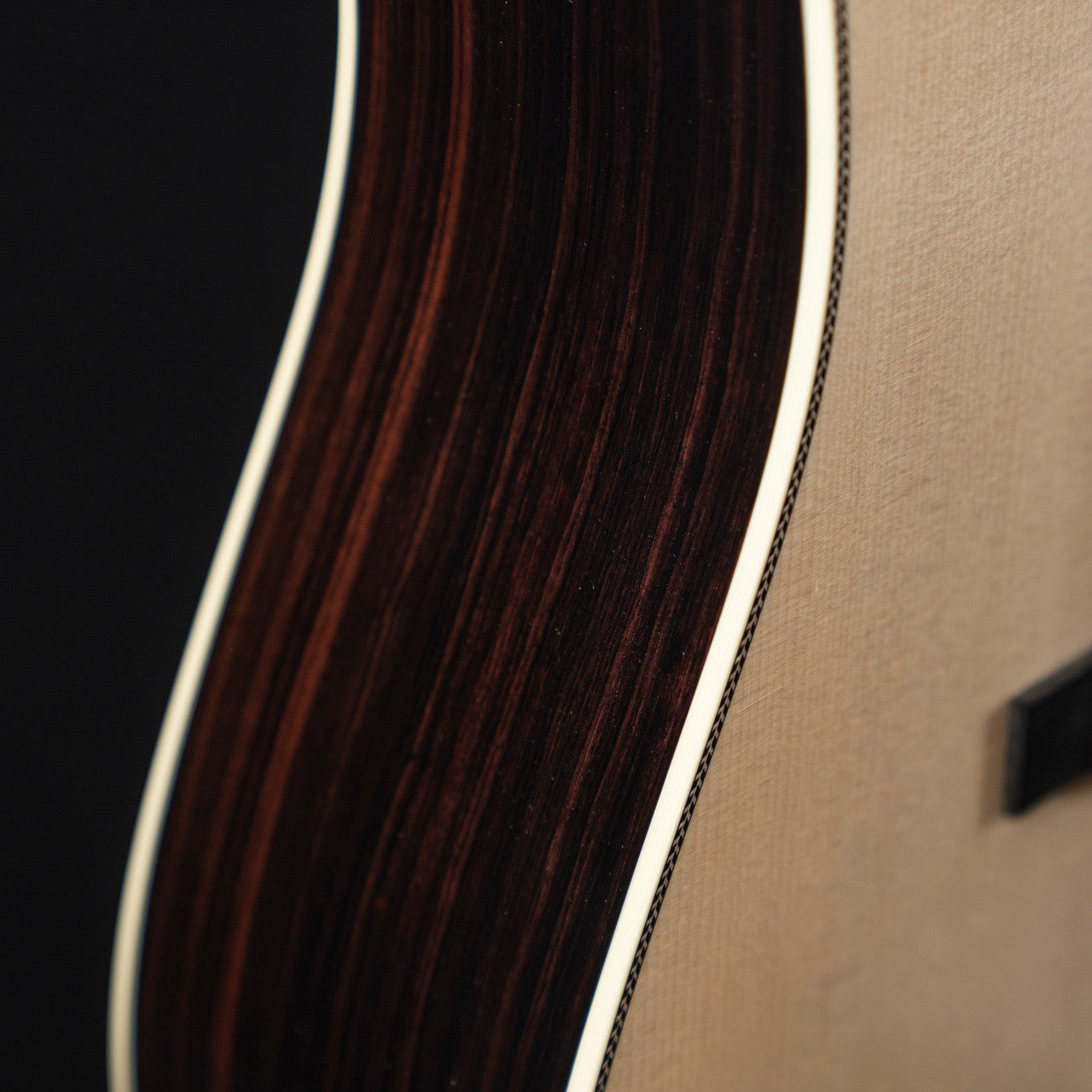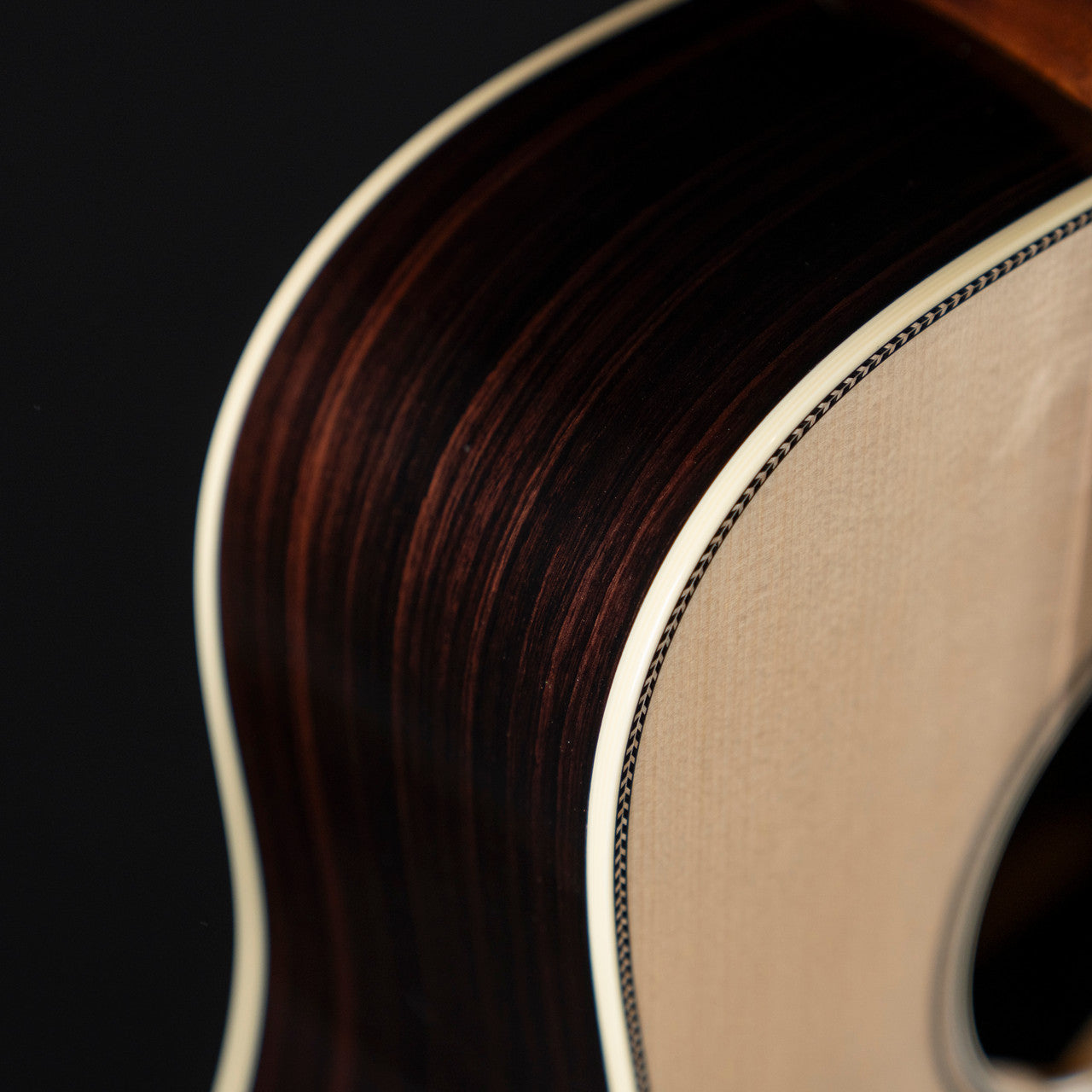 With vintage-inspired details like the 1930s-style herringbone purfling, vintage zig-zag backstrip, and large soundhole ivoroid rosette, this model transports you back to the golden era of acoustic guitar craftsmanship. The Madagascar rosewood head veneer adorned with a Mother of Pearl logo adds a touch of elegance, and the Waverly Nickel Butterbean tuners ensure precise tuning and stability.