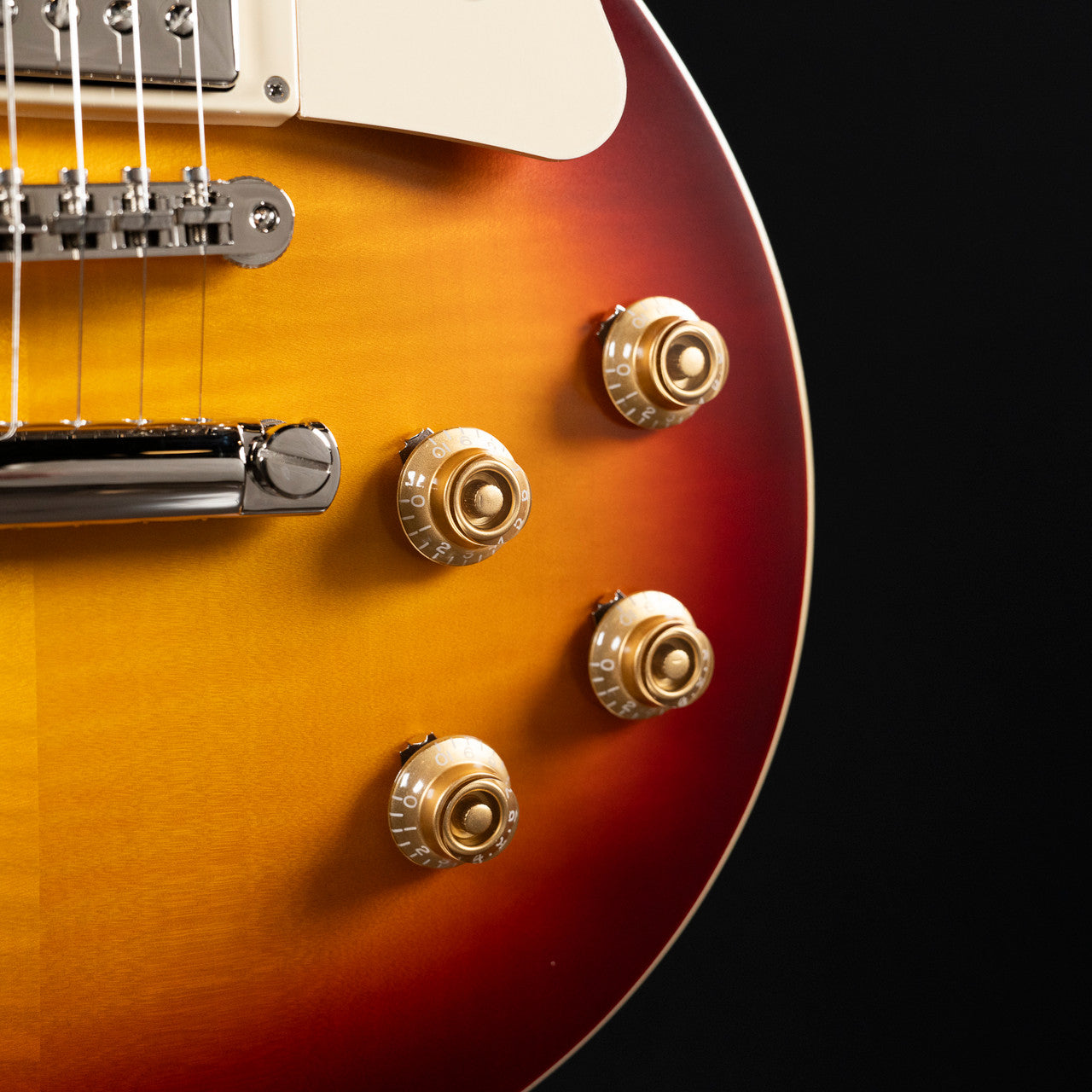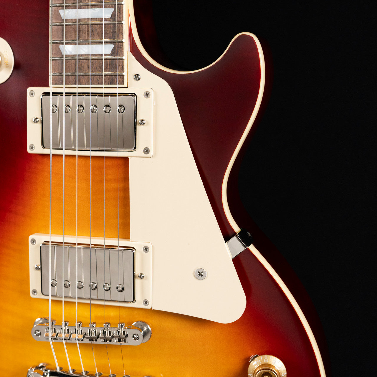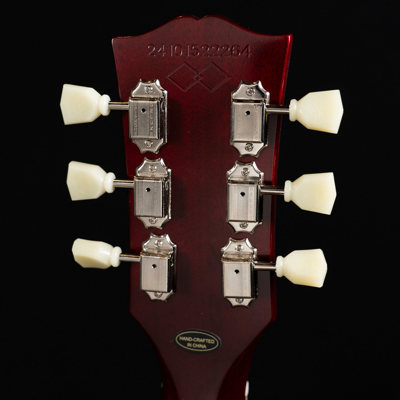 - Additional Features: Cream binding on the body, neck, and headstock, “Les Paul” style pickguard, vintage-style amber top hats with reflectors