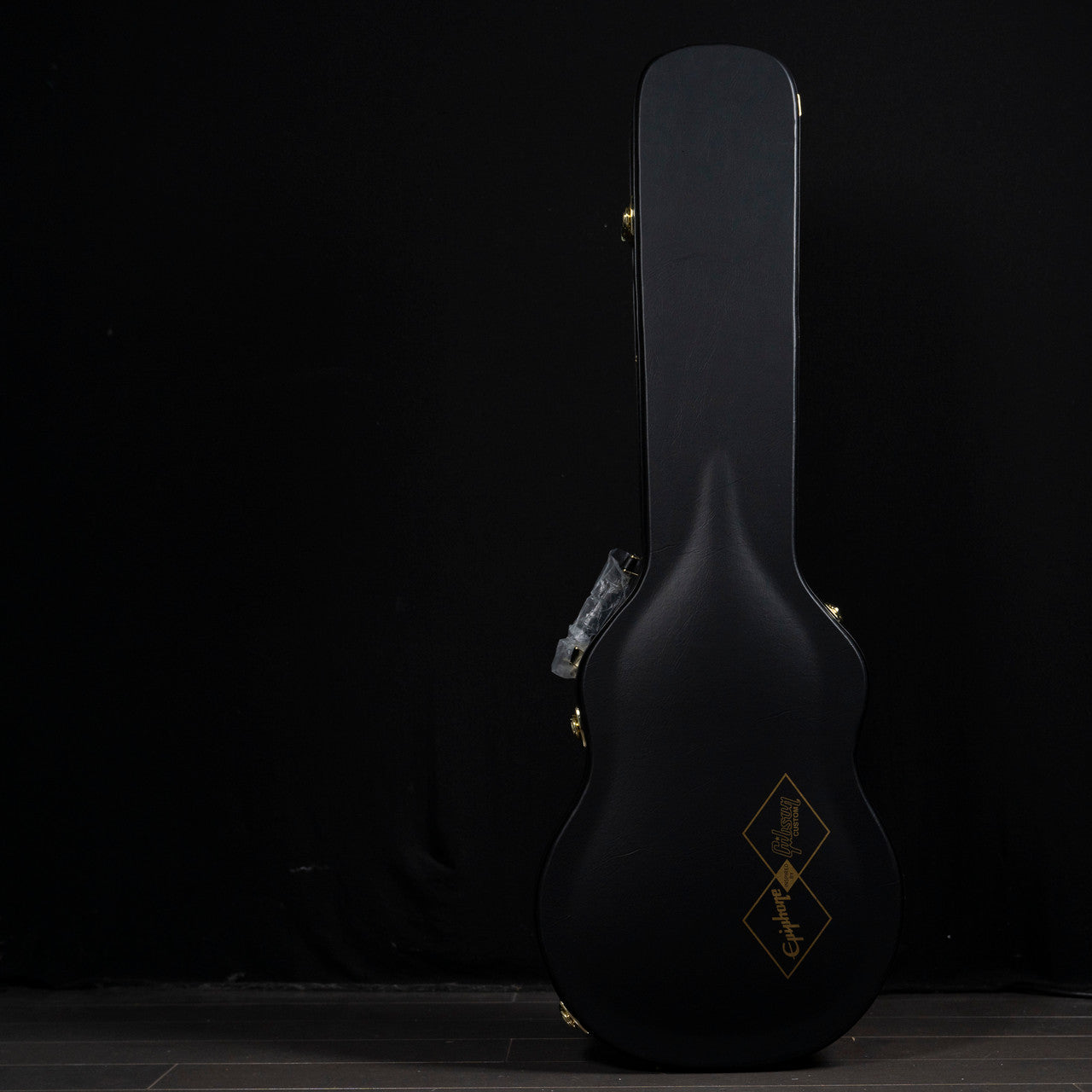 As part of the ongoing collaboration with Gibson™ Custom, Epiphone is proud to introduce the flagship Les Paul™ Custom to the Inspired by Gibson Custom lineup. Replete with all of the classy “tuxedo” appointments that the model is known for, this beautiful guitar has a one-piece mahogany neck with a Modern Medium C profile, an ebony fretboard, and mother-of-pearl block fretboard inlays. There are also mother-of-pearl split diamond and Epiphone logo headstock inlays on the Gibson-style “open book” headstock. Gold hardware, including Grover® Rotomatic® 18:1 gear ratio tuners, gives it even more visual appeal. The solid mahogany body has a maple cap for a touch of added sonic bite, while the Gibson USA 490R and 498T pickups provide tonal sophistication and plenty of muscle to back up all the beauty. They’re hand-wired to CTS® potentiometers, a Switchcraft® output jack and pickup select switch, and Mallory™ capacitors. An Inspired by Gibson Custom double diamond logo is on the back of the headstock, and a black hardshell case with the Inspired by Gibson Custom logo and a goldenrod interior is also included.