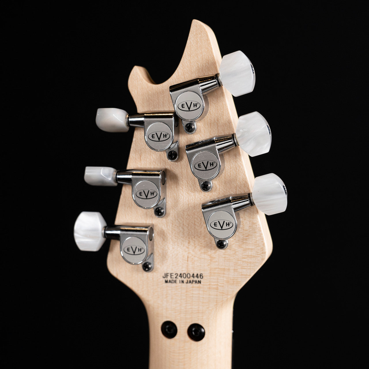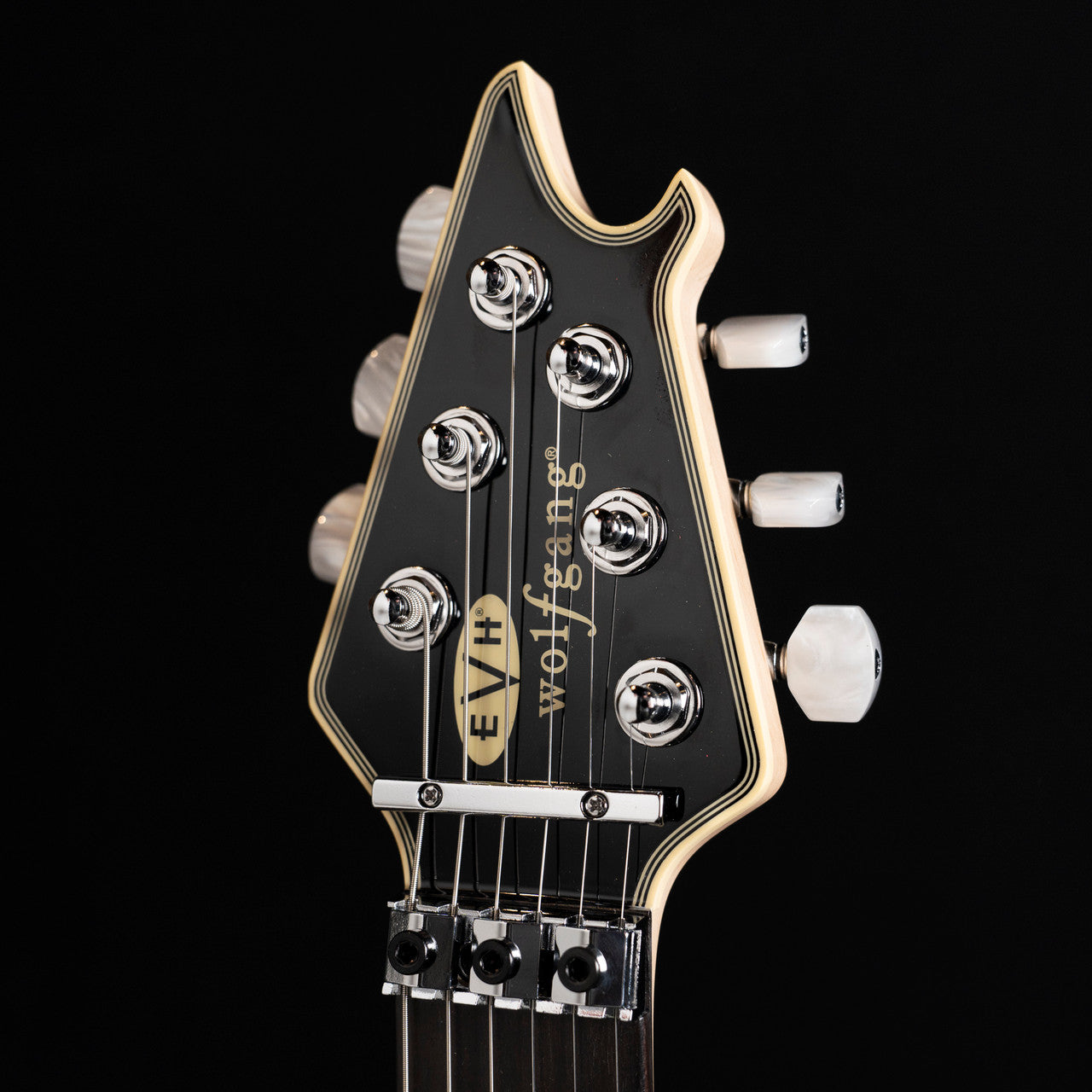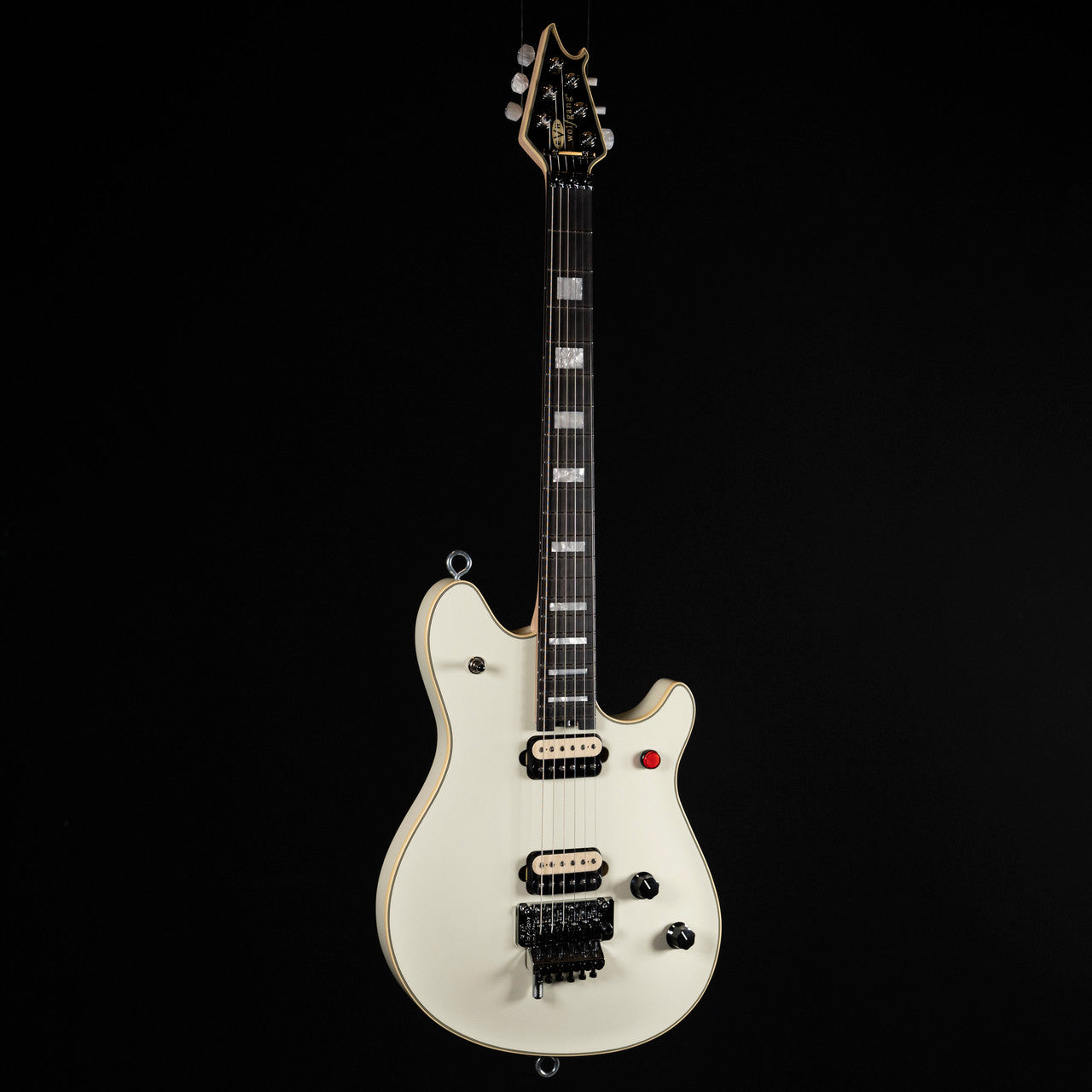 The all-new MIJ Series EVH Signature Wolfgang® is offered in Ivory or Stealth Black finishes, each with cream body binding, black knurled control knobs, chrome eye hook strap buttons and black headstocks. The Ivory finish features pearloid block inlays and chrome nut, retainer bar and tuners, while the Stealth finish features pearloid dot inlays, chrome nut, black retainer bar and black tuners.
