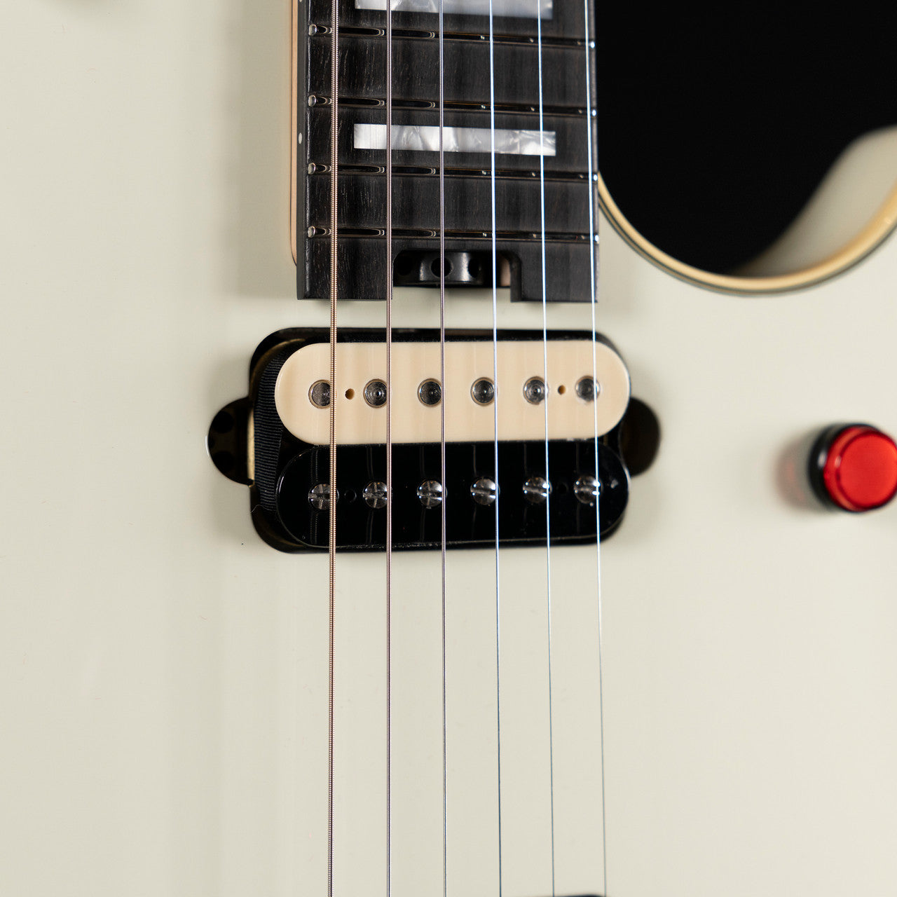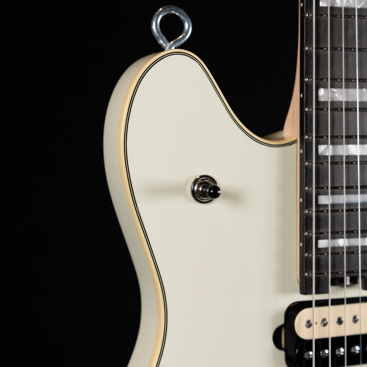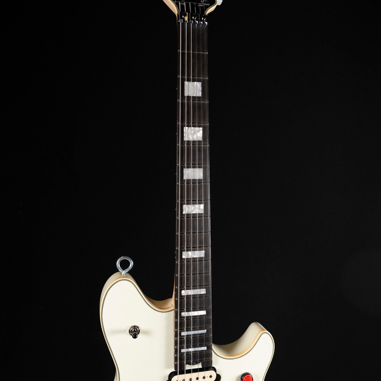 Available in Ivory or Stealth with cream body binding, black knurled control knobs, eye hook strap buttons and black headstocks; The Ivory finish features chrome nut, retainer bar and tuners, while the Stealth finish features a chrome nut, black retainer bar and black tuners.