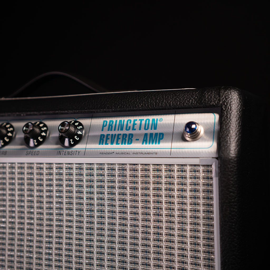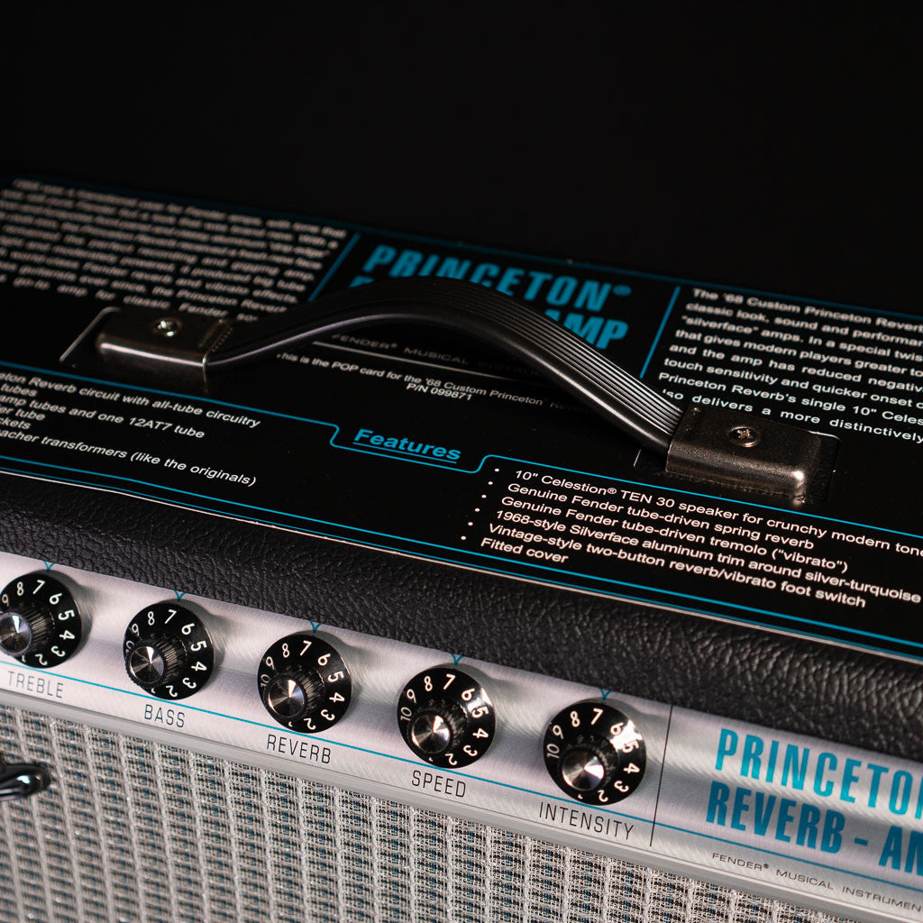 The guitarist with an eye and ear for late-'60s Fender "silverface" style will love the '68 Custom Princeton Reverb, which honors the classic look and great sound of that era's amps. Small, light and moderately powered, longtime recording and gigging favorite the Princeton Reverb received a fresh new face in 1968—a silver-and-turquoise front panel with aluminum grille cloth trim, with tone, reverb and tremolo that was still pure Fender. The '68 Custom Princeton Reverb also has modified tone circuitry for greater tonal flexibility with pedals and reduced negative feedback for greater touch sensitivity and quicker overdrive onset.