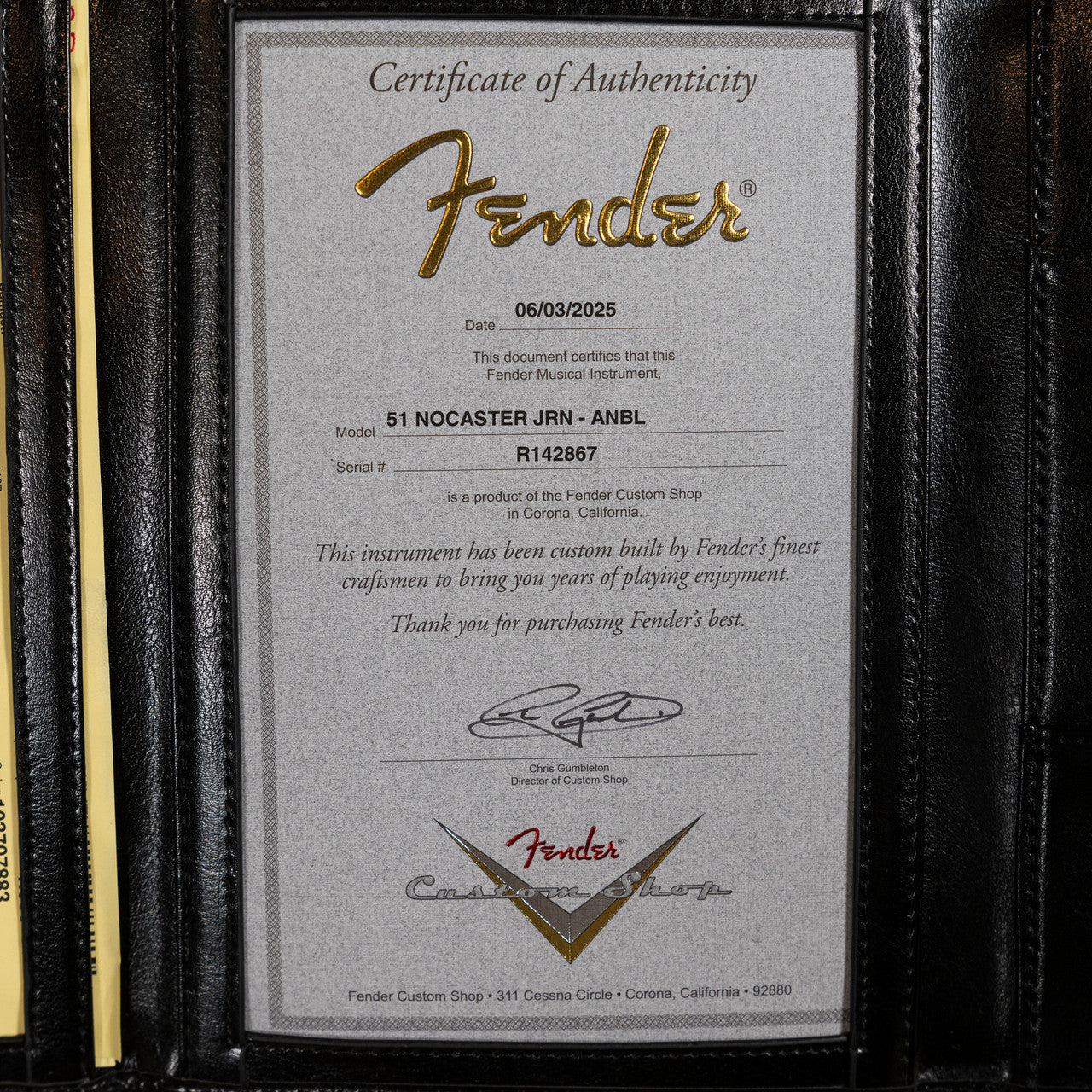 The Fender Custom Shop ’51 Nocaster Journeyman brings the raw power and simplicity of the legendary early Tele into your hands, with just the right touch of vintage wear. Finished in Aged Nocaster Blonde, this ash-bodied workhorse has all the snap, twang, and punch that made the Nocaster a cornerstone of rock, blues, and country. The 1951 “U” shaped neck feels substantial yet incredibly playable, while the compound 7.25"–9.5" radius fingerboard makes bending effortless without losing that old-school vibe. Outfitted with hand-wound ’51 Nocaster pickups, this guitar delivers everything from cutting leads to rich, dynamic rhythm tones with authenticity and bite.
