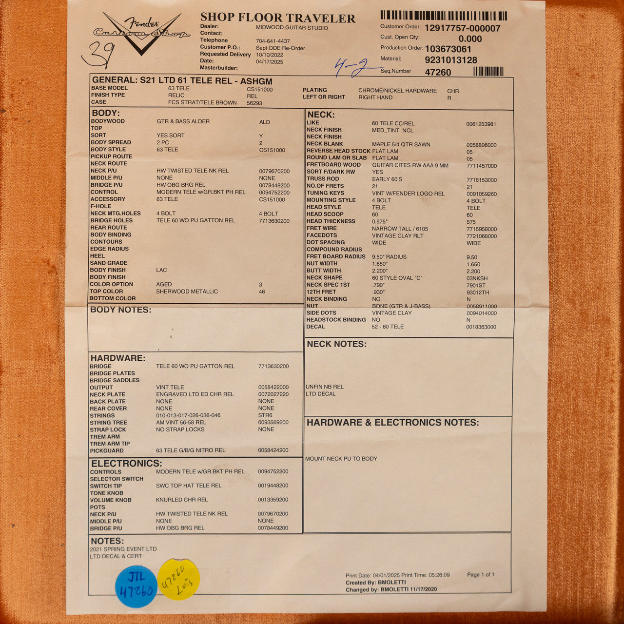 Welcoming in a gorgeous Fender Custom Shop 1961 reissue Telecaster in Aged Sherwood Green. Featuring a stunning relic that shows lots of character, while telling an intricate story. Loaded with a blend of a hand wound twisted tele in the neck, and a hand wound "Original Blackguard" in the bridge for a world of classic Telecaster tones. This Tele is set up to a T, allowing for effortless playability all the way up the neck. We are thrilled to have such an amazing guitar here at the shop. Comes with a Custom Shop hardshell case and all of the expected case candy, COA, etc. Buy with confidence!