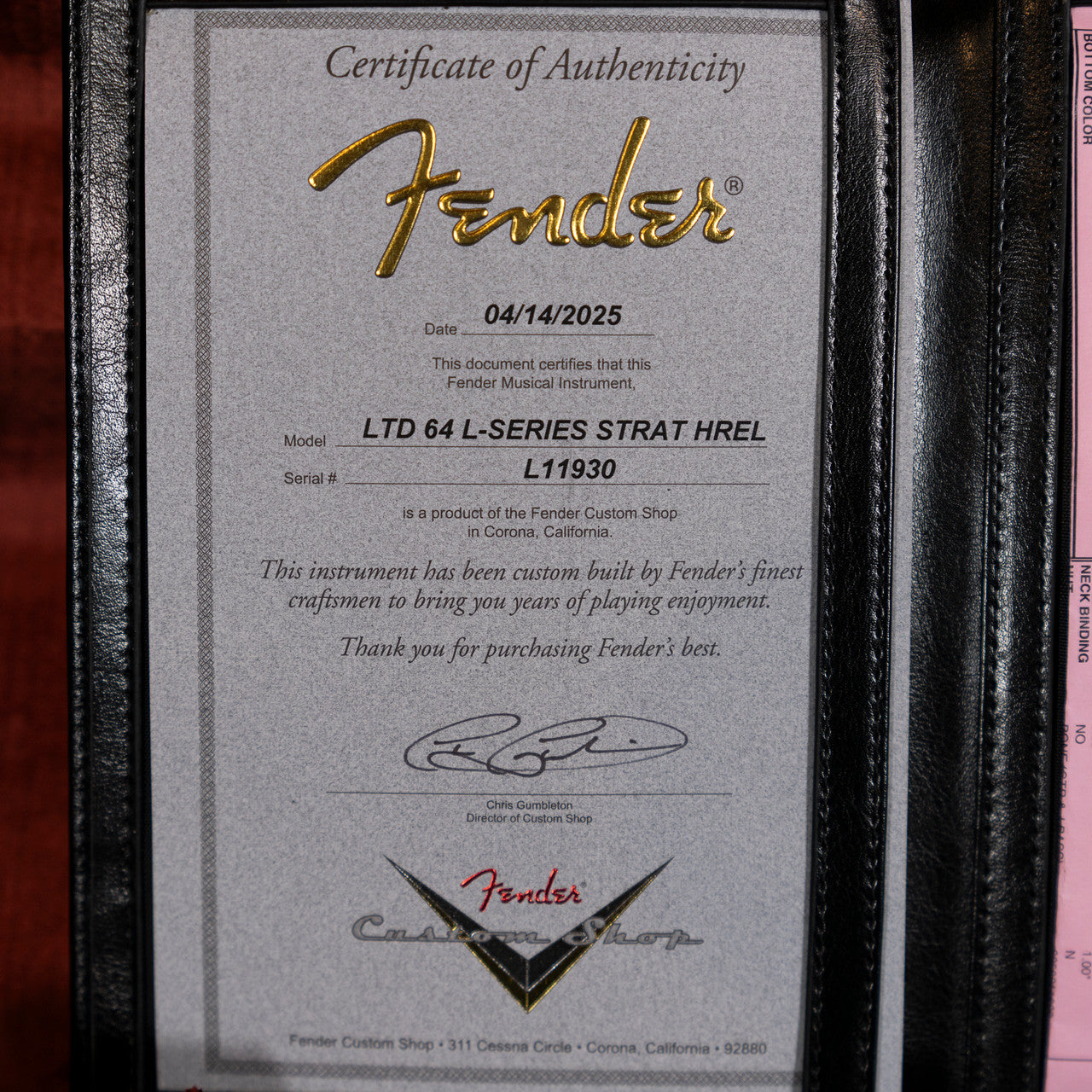 Its rift-sawn maple neck is fashioned with a comfortably easy-playing 1963-style “C”-shaped profile, topped by a round-lam rosewood fingerboard with a compound radius (7.25” to 9.5”) 21 medium vintage (47095) frets and a bone nut. Classic Strat tone of that period comes from three Custom Shop hand-wound ’64 Stratocaster pickups (reverse-wound/reverse-polarity middle pickup for hum cancellation in switch positions 2 and 4) that deliver clear highs, well-balanced mids and tight lows, routed through five way switching and Vintage Modified #2 wiring with the Tone-Saver bleed circuit, which eliminates tone loss when volume is turned down.