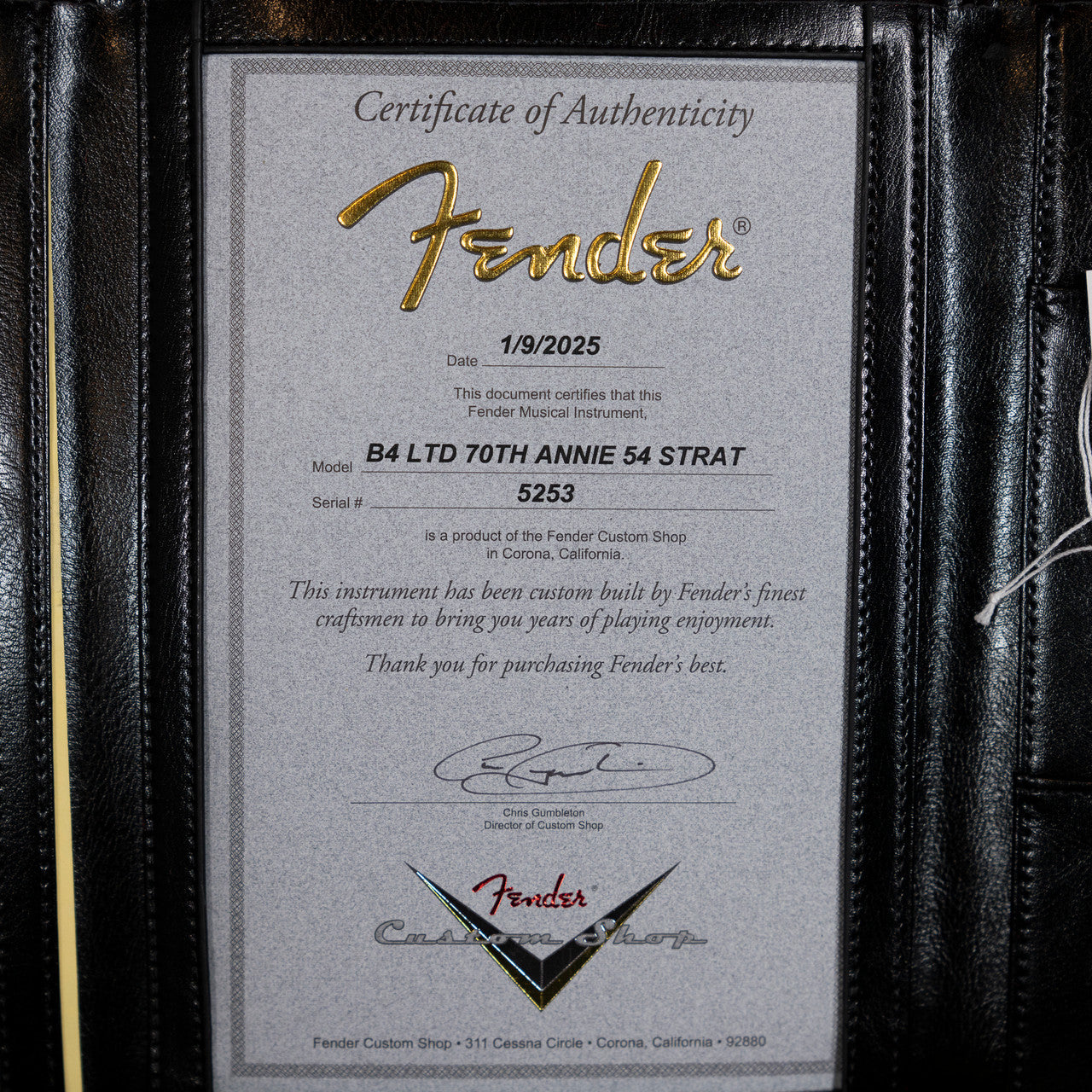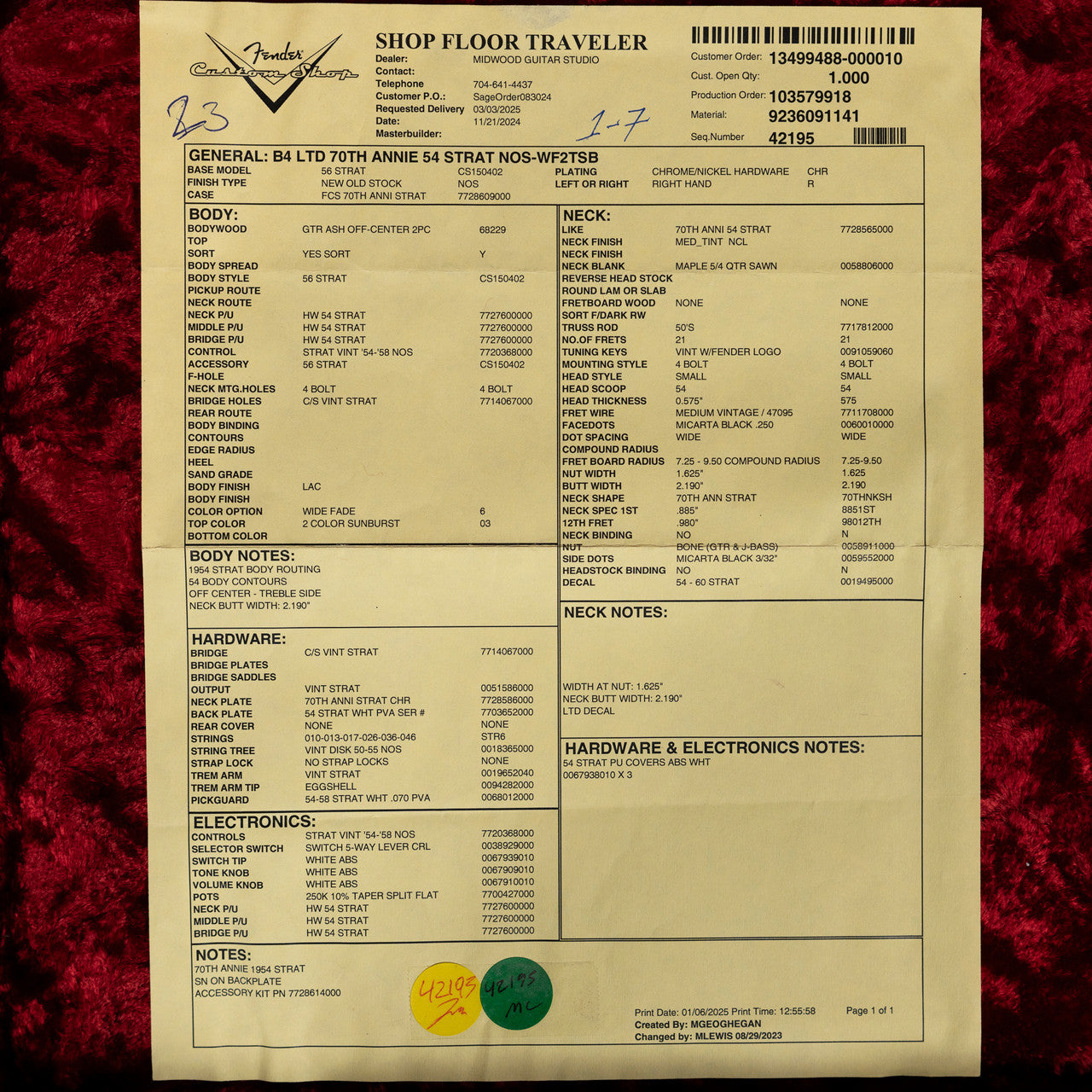 Welcoming in this absolutely stunning Fender Custom Shop LTD 70th Anniversary '54 Stratocaster New Old Stock in the beautiful Wide Fade 2 Color Sunburst. Featuring a set of Hand-wound 54 Stratocaster single coil pickups, a 7.50 - 9.50" Compound fingerboard radius, medium vintage fret wire and a wide "C" shape neck. This is everything a Stratocaster should be. Loaded to the T with desirable specs, vintage vibe, immaculate playability and tone for days. We are thrilled to offer you this amazing guitar and guarantee it to be a huge source of inspiration. Comes with a hardshell case and all of the custom shop case candy.