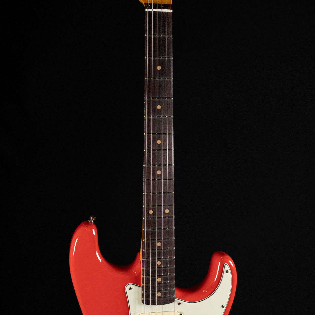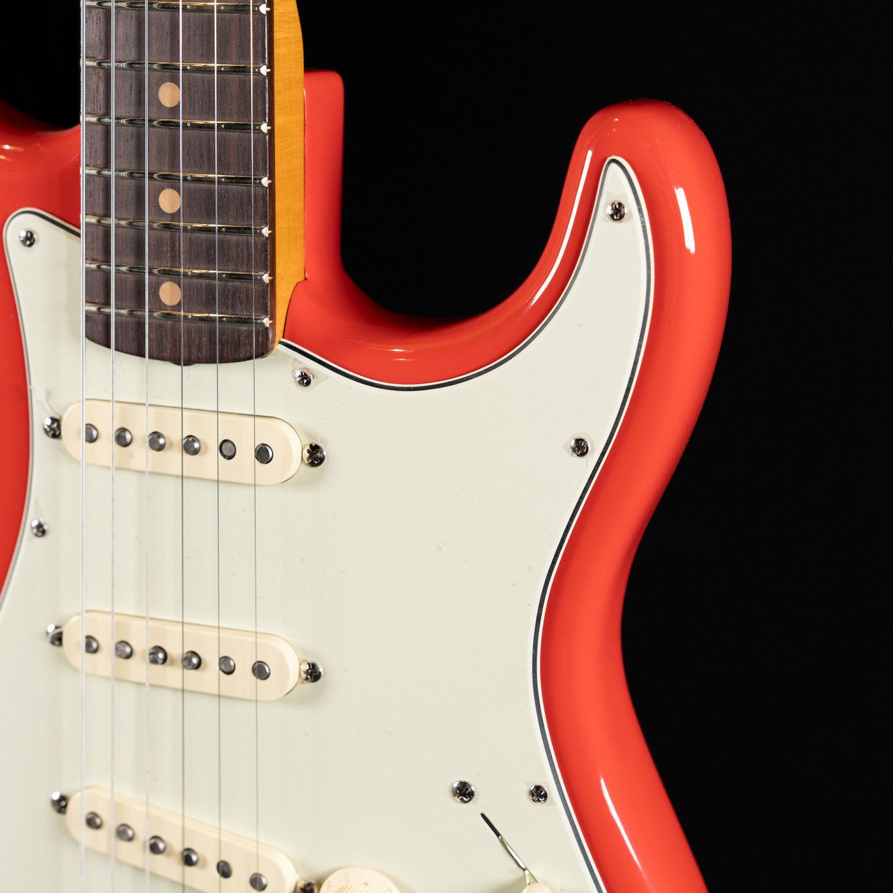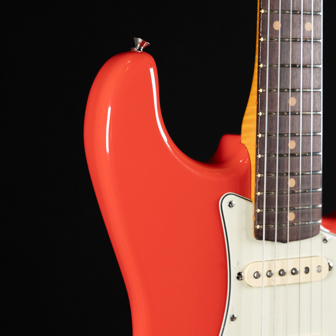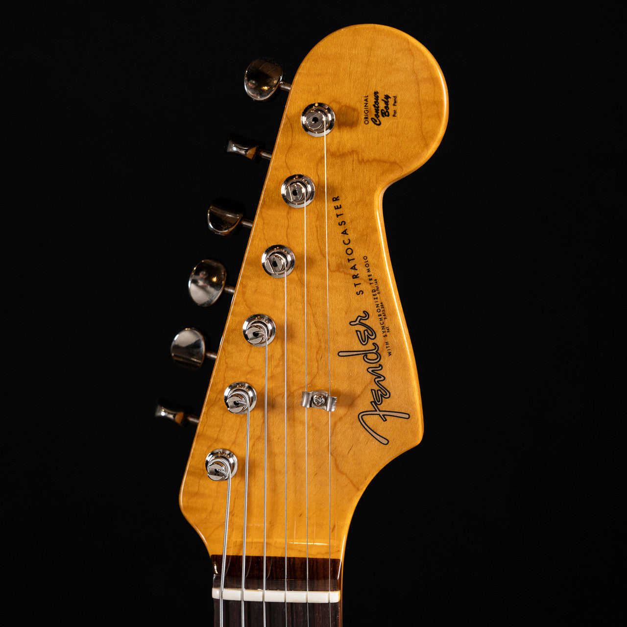 A beautifully figured 3A flame maple neck features a comfortable 1961 “C” profile with a satin-finished back for a smooth, broken-in feel. The slab rosewood fingerboard offers a 7.25″ radius with vintage-tall frets and classic clay dot inlays. Three Custom Shop Fat ’60s single-coils deliver warm, glassy Strat tones, with a 5-way switch and traditional control layout.