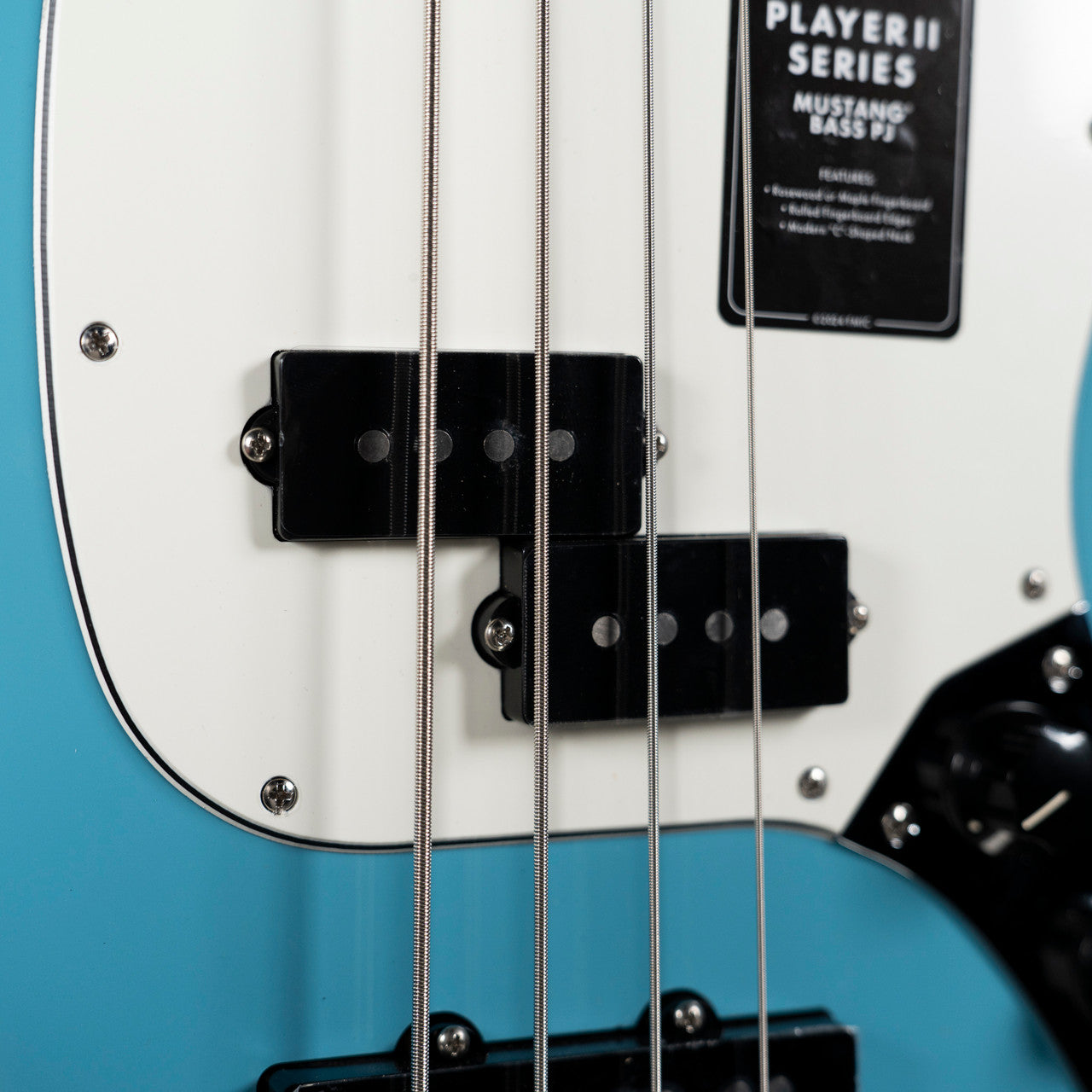 The Player II Mustang® Bass PJ radiates timeless Fender charm, but under the hood, it's primed for today's players. Everything about the neck is designed for fast and fluid playability, from the Modern “C”-profile with silky satin urethane finish on the back to the comfy 9.5”-radius slab rosewood or maple fingerboard with smooth rolled edges and 19 medium jumbo frets. A classic alder body is available in both timeless Fender finishes and never-before-seen colors unearthed from the archives. Player Series Alnico V Split-Coil P bass® and Single-Coil J bass® pickups offer sweet highs, growling mids and seismic lows that elevate any genre. The 3-way toggle switch lets you easily dial in everything this versatile pickup set has to offer, while an adjustable 4-saddle bridge, single-groove steel saddles and open-gear tuners ensure precise tuning stability for the flexibility to explore endless sonic possibilities.