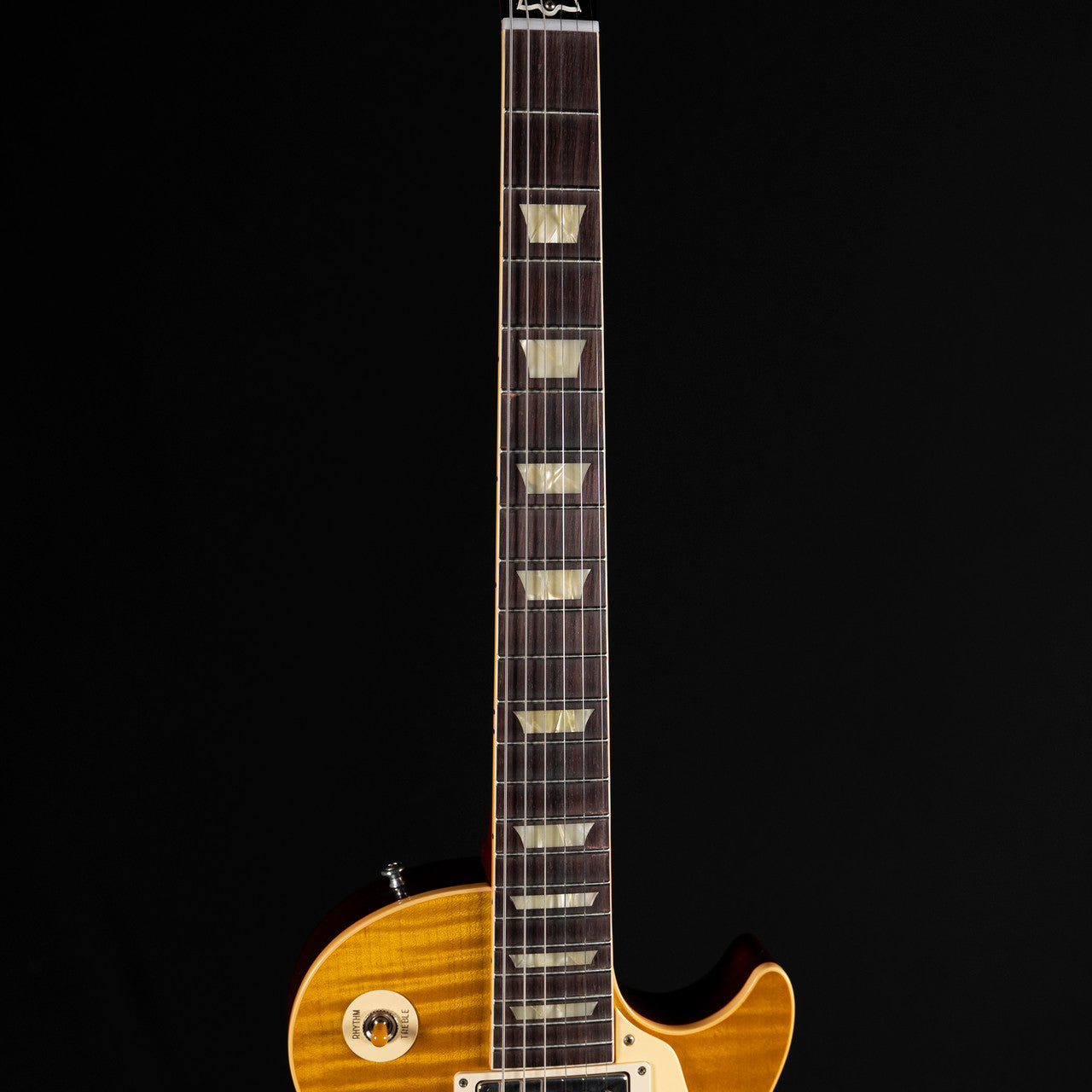 The Gibson Custom Shop 1959 Les Paul Standard VOS in Dirty Lemon Burst is a stunning recreation of the most iconic electric guitar ever made, offering the tone, feel, and look of a true vintage ’59 Burst. Crafted with a beautifully figured maple top and a solid mahogany body, this R9 features period-correct hide glue construction, narrow/tall frets, and a long neck tenon for maximum resonance and sustain. The Dirty Lemon Burst finish, aged with Gibson’s Vintage Original Spec (VOS) treatment, gives it an authentic, slightly worn-in patina that captures the soul of a well-loved classic. The chunky ’59 neck profile, paired with a dark rosewood fingerboard, delivers exceptional playability and a rich tonal foundation. Equipped with CustomBucker Alnico III pickups, this guitar delivers the legendary PAF-style tone—articulate, warm, and harmonically complex. A vintage-style hardshell case and Certificate of Authenticity complete this collector-grade instrument, making it a top-tier choice for serious players and aficionados alike.