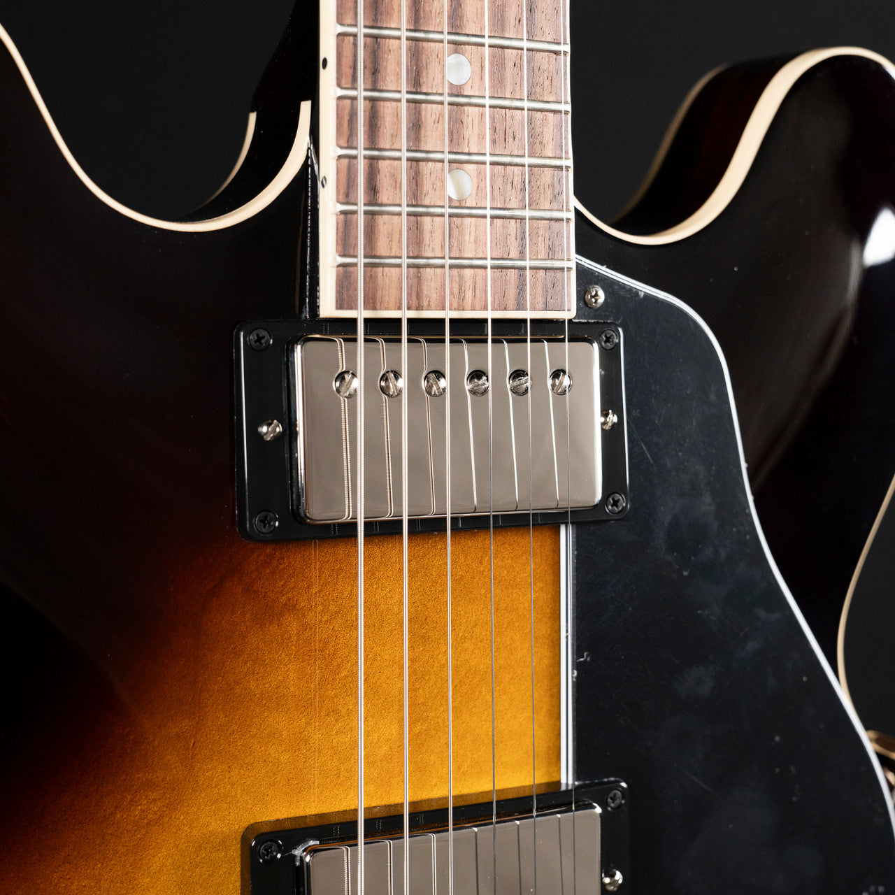 Welcoming in this timeless Gibson ES-335 Semi-Hollow Electric Guitar in Vintage Burst. Featuring a semi-hollow construction with spruce bracing and a maple center-block, a beautiful rosewood fretboard with a 12" radius and two Gibson calibrated T-type humbucking pickups. The ES-335 is a quintessential guitar used by a massive array of artist covering just about every genre. The pickups allow for crystal clear cleans to beautiful smooth overdriven tones and beyond. This one weighs in just under 8lbs and is set up to a T. We are thrilled to offer you this amazing guitar and guarantee it to be a huge source of inspiration in any set of hands.