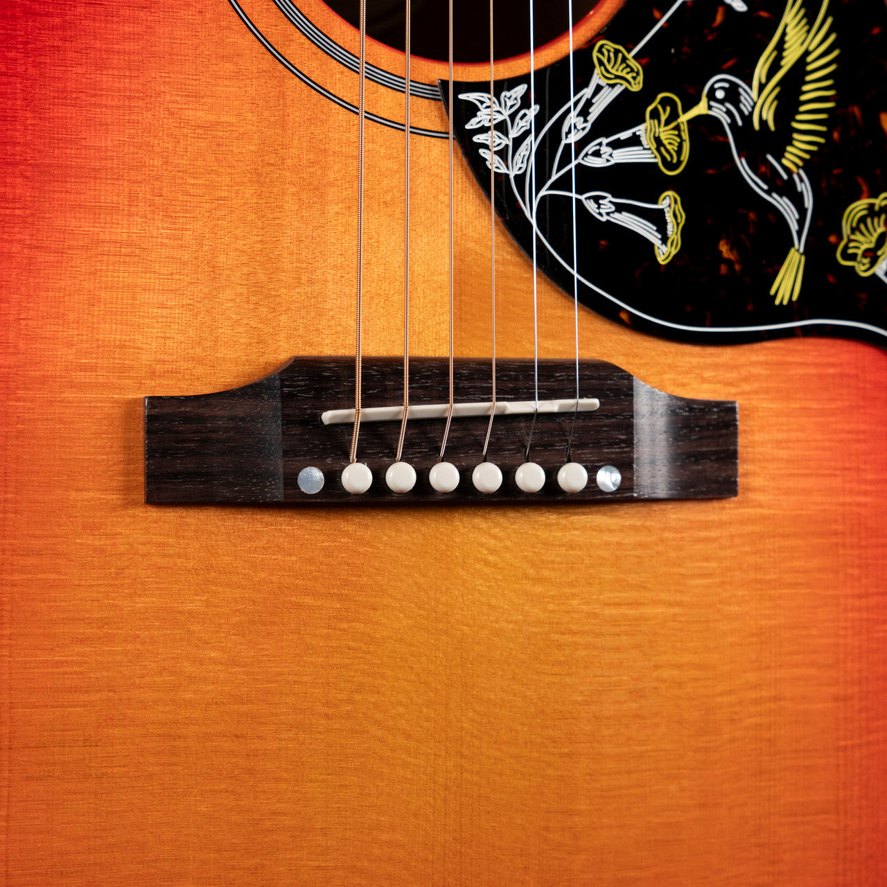 Much of the Hummingbird’s appeal lies in its versatility. No matter how you attack this flat-top, it pumps out rich, deep tones, and is equally at home strumming first-position chords as it is taking the spotlight for picking lead lines. Its spacious mahogany body and sweet, select Sitka spruce top are more than capable of nailing down the rhythm in the hands of a rock and roll sideman or accompanying the most nuanced performance under the fingers of today’s alternative singer-songwriter. The Hummingbird's mahogany neck has a comfortable rounded profile and mother of pearl parallelogram inlays. This 'bird has a TUSQ® nut, saddle, and bridge pins, Grover® Rotomatic® tuners, the iconic Hummingbird™ graphics on the pickguard, and is equipped with LR Baggs® VTC electronics, so it's ready to plug in on stage or in the studio. A Gibson hardshell case is included.