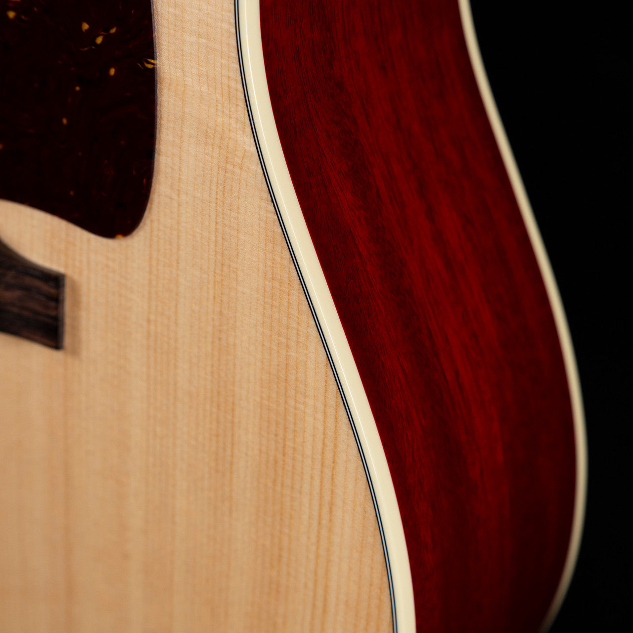 Welcoming in a gorgeous Gibson J-45 Standard Acoustic Guitar in Natural with a Red Back. Featuring a sitka spruce top, mahogany back and sides, a slim taper neck profile and a LR Baggs VTC pickup. The J-45 is a staple guitar and has been used on thousands of records from country music to rock and roll. It provides a wide range of highly sought after acoustic tones that work perfectly with a band, or playing and writing songs at home. Set up to a T allowing for flawless playability all the way up the fretboard while looking and feeling incredible. We are thrilled to offer you such an amazing guitar! Comes with a hardshell case.