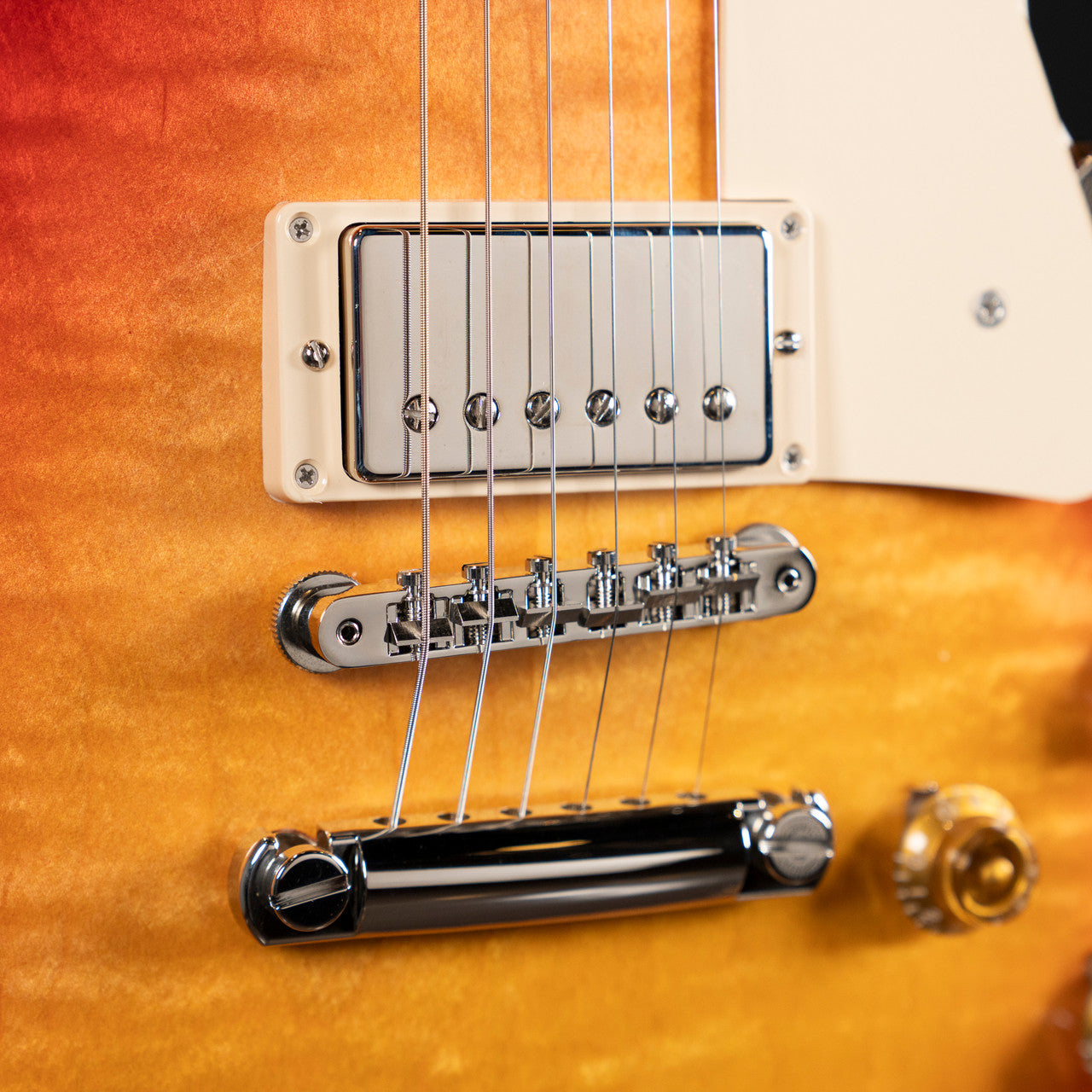 Just in from the Gibson Workshop is a Gibson Les Paul Standard 50s Figured Top in a gorgeous Heritage Cherry Sunburst finish. Featuring a figured maple top, mahogany body, vintage 50's neck profile and a set of Gibson Burstbucker pickups. This guitar perfectly recreates that of which created a staple in guitar and music history forever. Replicating tones that have been sought after for over 70 years all while having that classic vintage Les Paul feel. We are thrilled to offer this amazing guitar to you, this is a fun one that will be incredibly hard to put down! Gibson operates by upholding the highest standards of quality and craftsmanship and this guitar is no exception. Comes with a hardshell case and Gibson case candy.