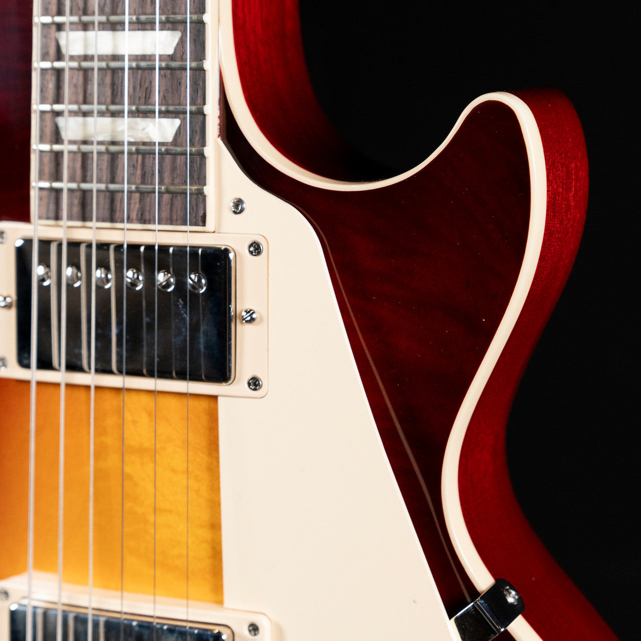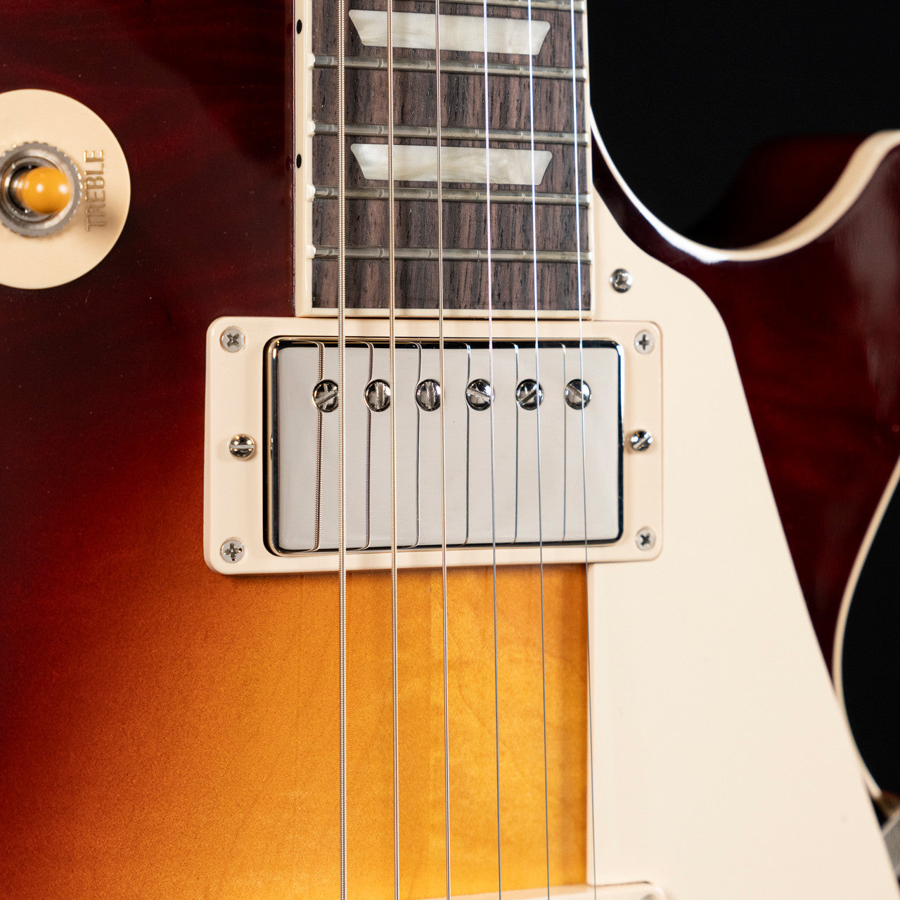 The new Les Paul™ Standard returns to the classic design that made it relevant, played, and loved – shaping sound across generations and genres of music. It pays tribute to Gibson's Golden Era of innovation and brings authenticity back to life. The Les Paul Standard '60s has a solid mahogany body with an AA figured maple top and a SlimTaper™ 60s-style mahogany neck with a rosewood fingerboard and trapezoid inlays. It's equipped with a classic ABR-1 Tune-O-Matic™ bridge, aluminum Stop Bar tailpiece, Grover® Rotomatic® "Kidney" tuners, and gold Top Hat knobs with silver reflectors. The 60s Burstbucker™ pickups are loaded with Alnico 5 magnets and wired to audio taper potentiometers and Orange Drop® capacitors.