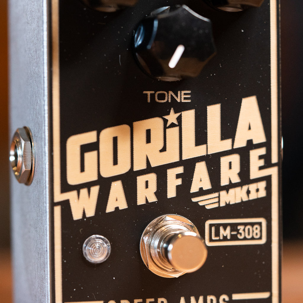 We’ve all had those late nights, filled with loud music, questionable decisions, and the occasional run-in with a big, beastly monster that wants to rip our faces off…right? Well…this is that night, in pedal form. The Gorilla Warfare MKII is a pedal that we have had a ton of requests for over the years. (We even did a super limited run of this pedal a while back, with a different graphic, and a different chip…that was then, this is now, and this…this is better.) I’ve been asked more times than I can count to do a “Greer Amps version of the RAT circuit…and do it right”…well…here it is. This is our angry, aggressive, larger-than-life and not-holding-back version of the old familiar circuit, complete with the good old LM308 chip. That’s an important detail—so we smacked it on the faceplate. This beast is powered by the same vintage chip that sparked folklore galore back in the day. We updated a few things, including the quality of the components used in the circuit, and you know that old Filter knob? Well, we turned it into a Tone control. It covers the exact same territory the original Filter control did, but…when you turn it up, you get more treble! AMAZING, I know! This beast is ready to melt rigs, rip faces off, and go to war. If you’re ready to try to tame this beast, step on up. If you’re ready to rock out, spit fire, and roast your ear holes, the Gorilla Warfare MKII is just what you need.