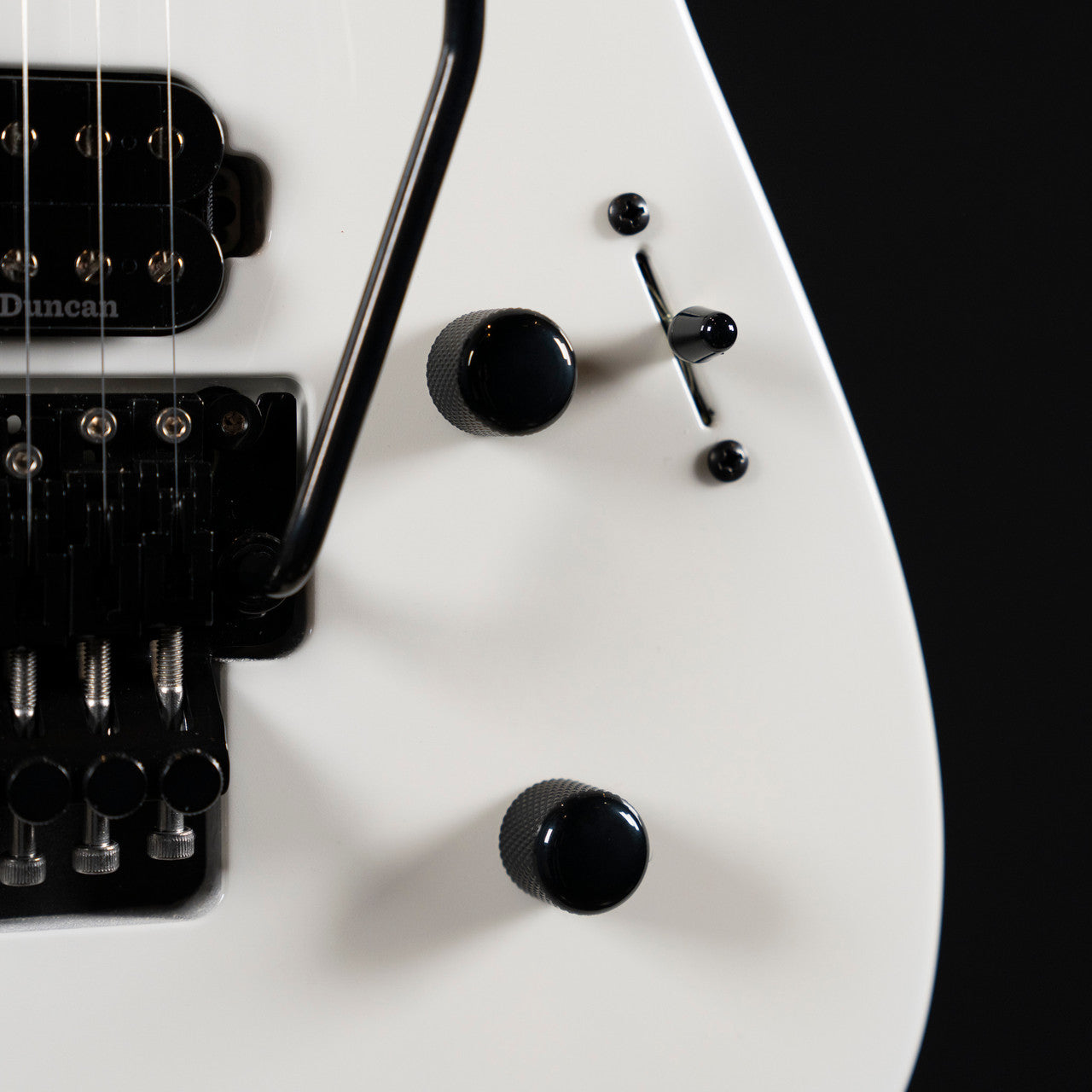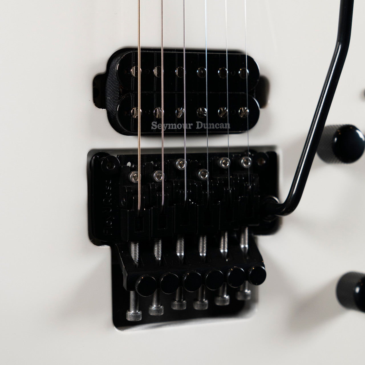 The HH pickup configuration features a Seymour Duncan® JB™ TB-4 humbucking bridge pickup that roars with hot-rodded attitude and a powerful low end, while the Seymour Duncan '59™ SH-1N neck pickup radiates with glassy treble tone and scooped mids that perform well across a multitude of genres. The intuitive control layout consists of a five-way blade switch, and dome-style knobs for volume and tone. Harness the sonic horsepower with a versatile five-way blade pickup switch and single volume and tone controls.Other premium features include a Floyd Rose® 1500 Series double-locking tremolo bridge system for reliable tuning stability throughout daring and aggressive playing theatrics, Gotoh® MG-T locking tuners and Dunlop® dual-locking strap buttons.