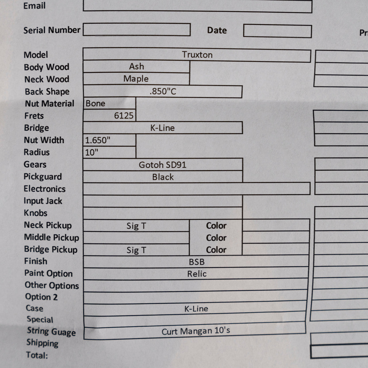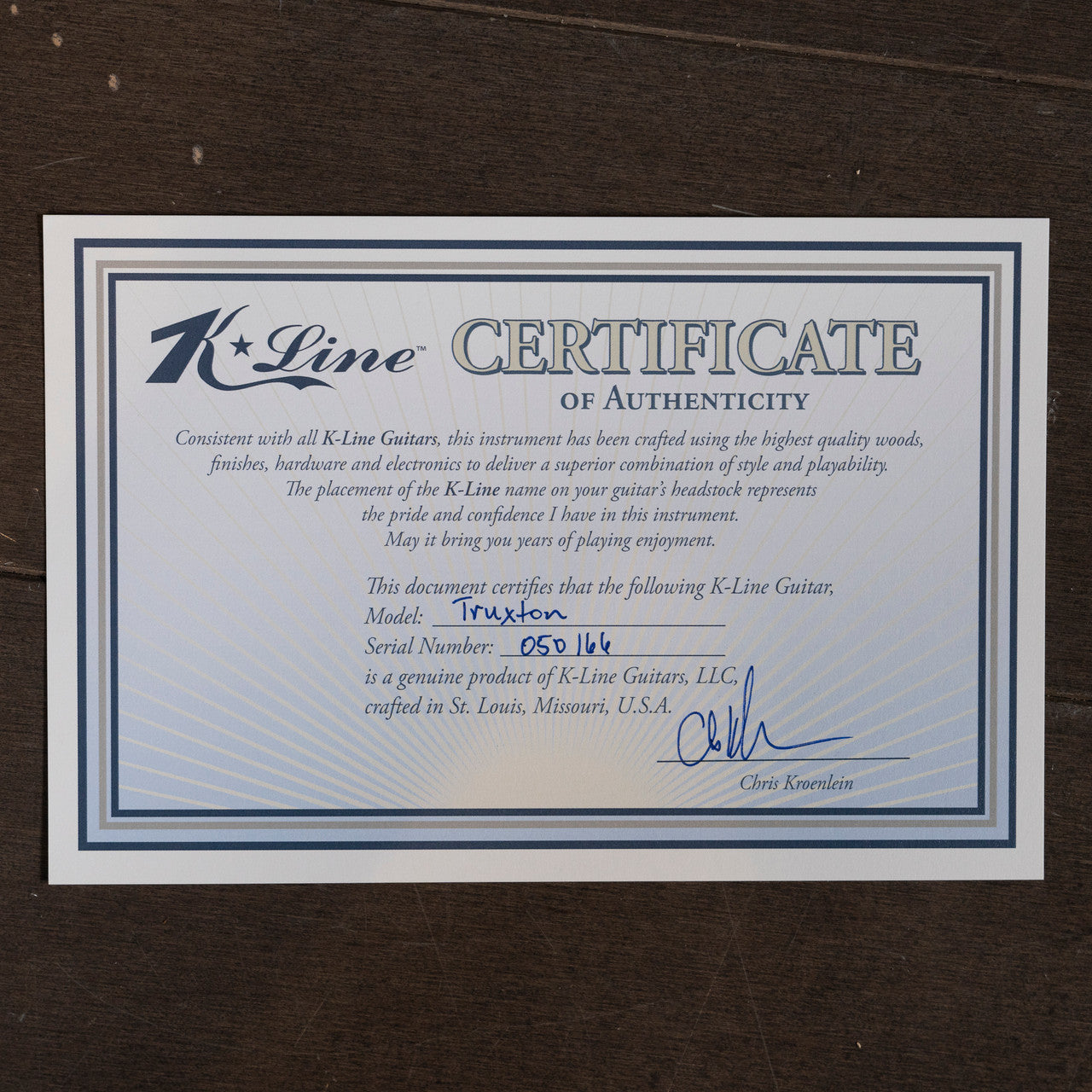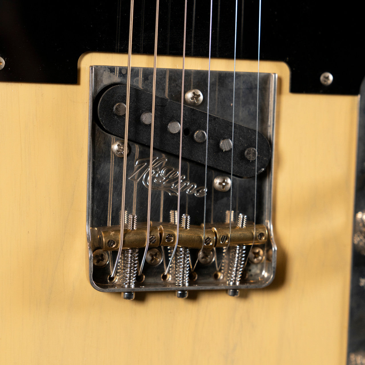 The K-Line Truxton in Butterscotch Blonde is a masterfully crafted interpretation of a vintage T-style guitar, blending classic aesthetics with boutique-level performance. Featuring an Ash body, maple fingerboard, and a comfortable .850" C-shaped neck, it offers a warm, resonant tone with excellent playability. Outfitted with Sig T pickups, the Truxton delivers rich, articulate tones that balance twang and warmth—perfect for everything from roots rock to modern Americana. The Butterscotch Blonde nitrocellulose finish exudes a timeless elegance, often lightly aged for that well-loved, road-worn vibe. With its meticulous build quality and hand-selected components, the Truxton is a go-to instrument for players who crave vintage inspiration with refined modern feel.