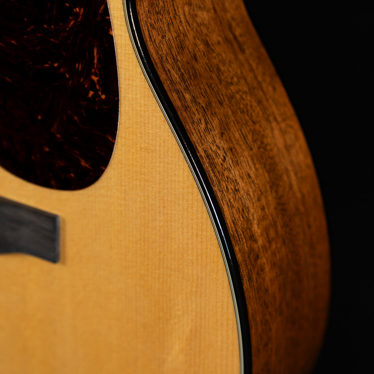 The high-performance neck ensures exceptional comfort and playability. Aesthetically, the aged toner on the top, paired with the tortoise binding and pickguard, gives the 00-18 a timeless vintage allure. The ebony fretboard, rosewood headplate, and rich mahogany back and sides create a visual harmony that’s both classic and refined.