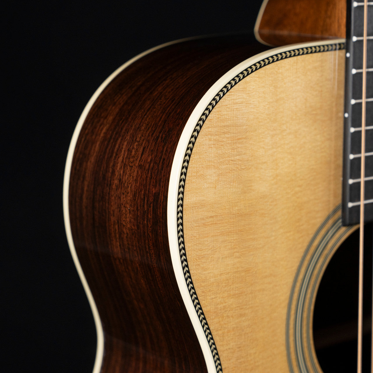 The amount of bass that this guitar generates is simply uncanny. The shorter scale length coupled with the scalloped bracing results in a deep scoop that emphasizes its low rumble and sparkling highs. The overtones shiver and settle in place delicately behind every chord. All that said, the smaller size lends it an intimate precision that makes it extremely easy to communicate with. Playing it is like confiding in (and being well understood by) an old friend. Aesthetically, it harkens back to the first grand concerts to bear the Martin name: aged toned toner on the still shimmery Sitka top, bold herringbone purfling, tortoise pickguard and binding. The back and sides are a rich East Indian rosewood with style 28 inlay down the center. From a feel standpoint, however, it’s geared towards modern versatility with a high performance, satin finished neck with a low-oval profile. It’s as fun to play as it is to hear! Please let us know if you have any questions!