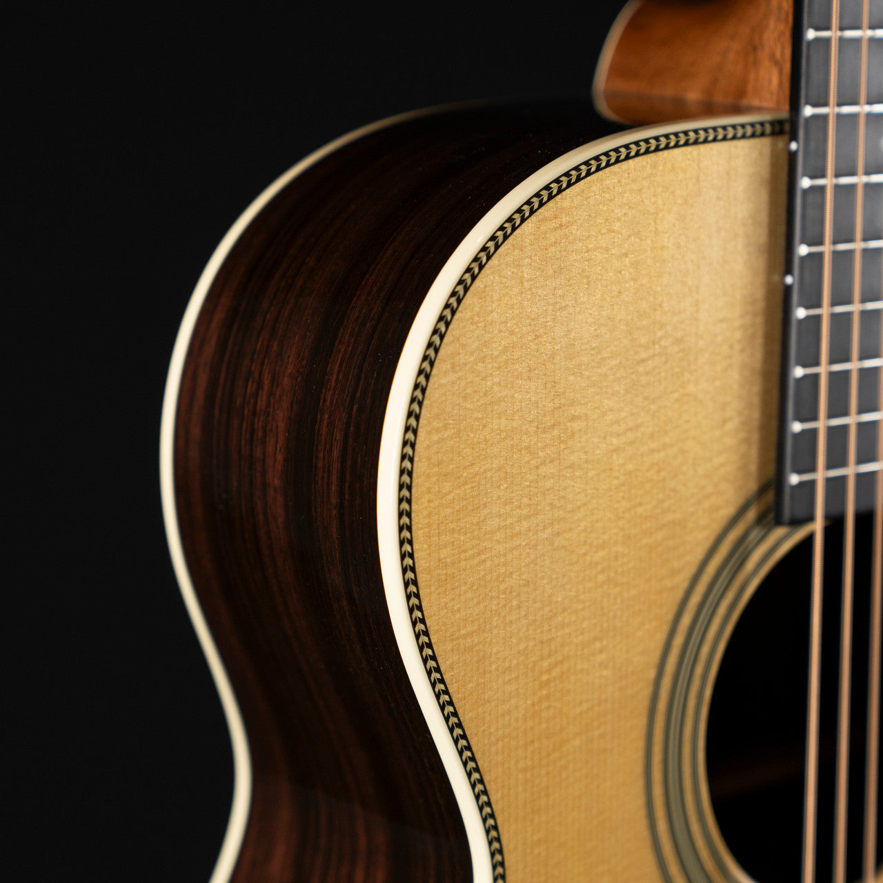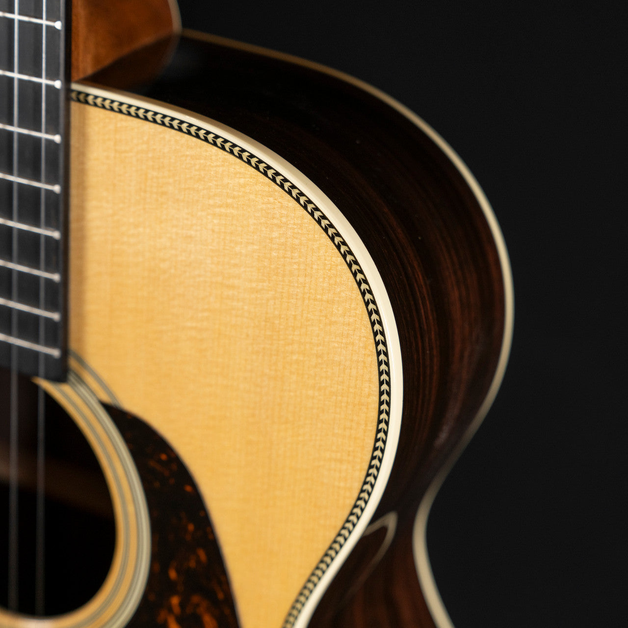 The amount of bass that this guitar generates is simply uncanny. The shorter scale length coupled with the scalloped bracing results in a deep scoop that emphasizes its low rumble and sparkling highs. The overtones shiver and settle in place delicately behind every chord. All that said, the smaller size lends it an intimate precision that makes it extremely easy to communicate with. Playing it is like confiding in (and being well understood by) an old friend. Aesthetically, it harkens back to the first grand concerts to bear the Martin name: aged toned toner on the still shimmery Sitka top, bold herringbone purfling, tortoise pickguard and binding. The back and sides are a rich East Indian rosewood with style 28 inlay down the center. From a feel standpoint, however, it’s geared towards modern versatility with a high performance, satin finished neck with a low-oval profile. It’s as fun to play as it is to hear! Please let us know if you have any questions!