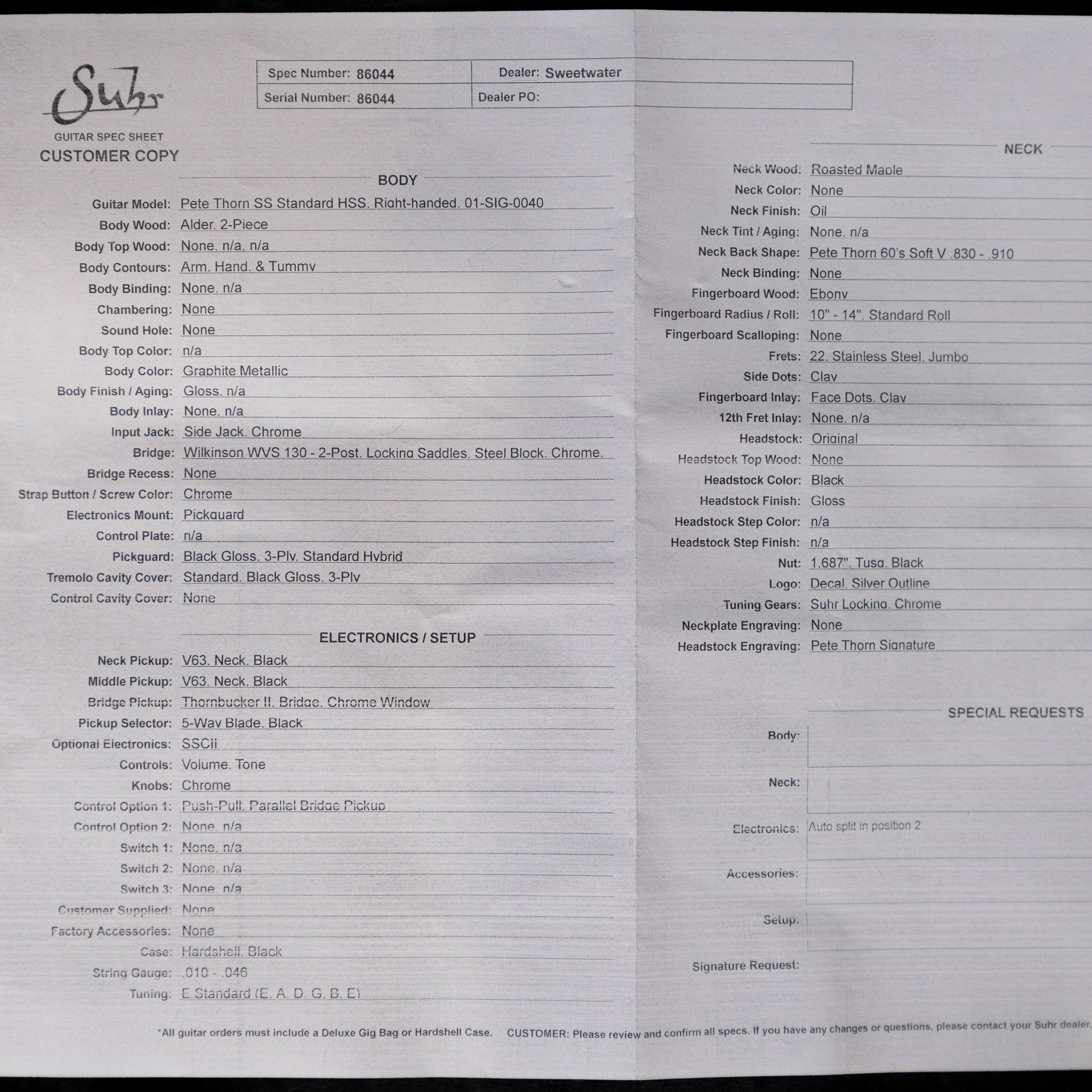 Preowned Suhr Pete Thorn Signature Custom HSS - Graphite Metallic