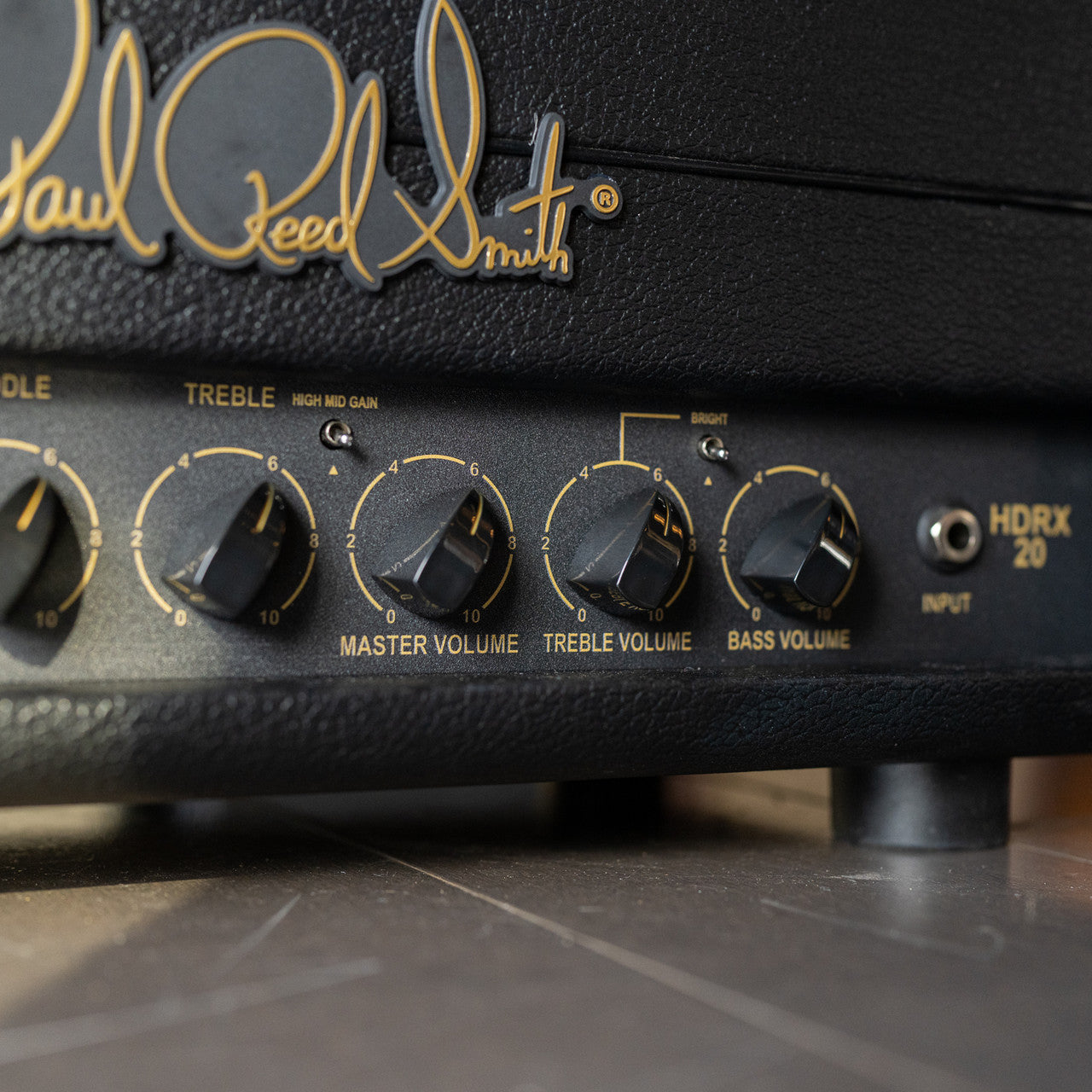 The PRS HDRX 20 features a 3-band TMB tone stack, 2-way bright switch, high-mid gain switch, and presence controls. These features mirror the historic amp and give players flexibility and increased control of their tone. The PRS HDRX 20 is also designed with internally bridged channels with individual treble and bass volume controls. This eliminates the need for a jumper cable (historically used on the outside of the amp) and allows players to dial in their distortion level and tone more easily by blending the lead and bass channels’ individual volume controls, bringing more modern convenience to the amp. The addition of a Master Volume control on the HDRX 20, a new feature for HDRX amps, is another modern convenience. Players can use the Master Volume to control the power amp section of the HDRX, making it more user friendly for players who do not want to add a volume attenuator to their setup.