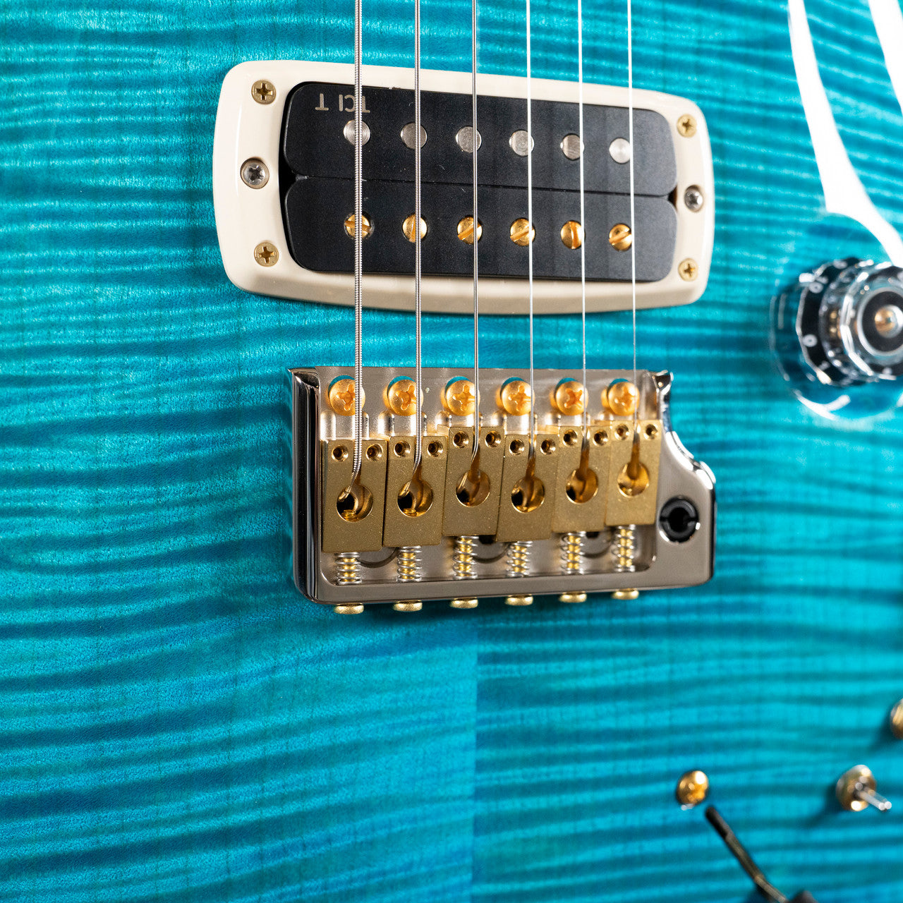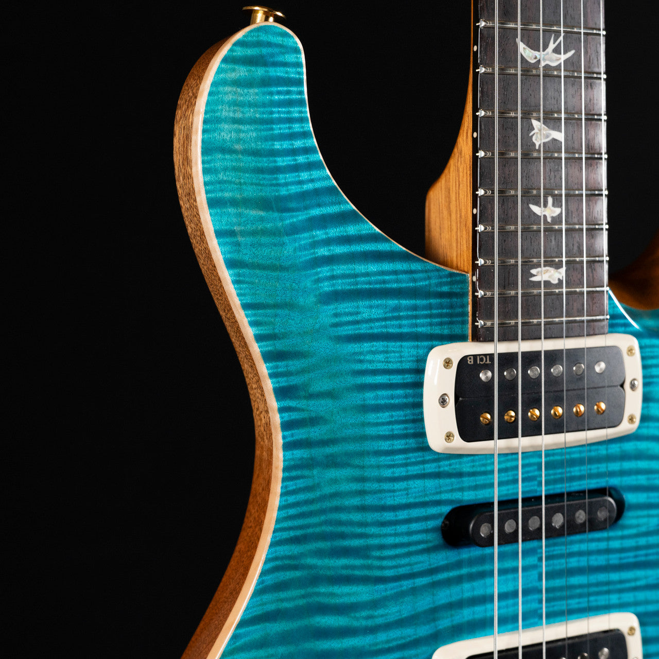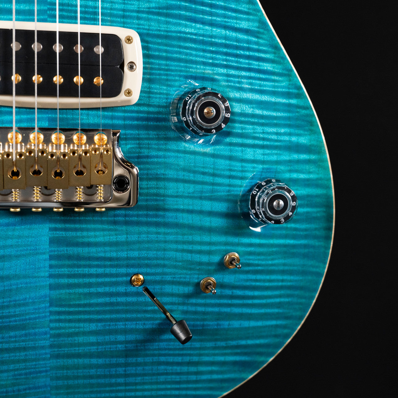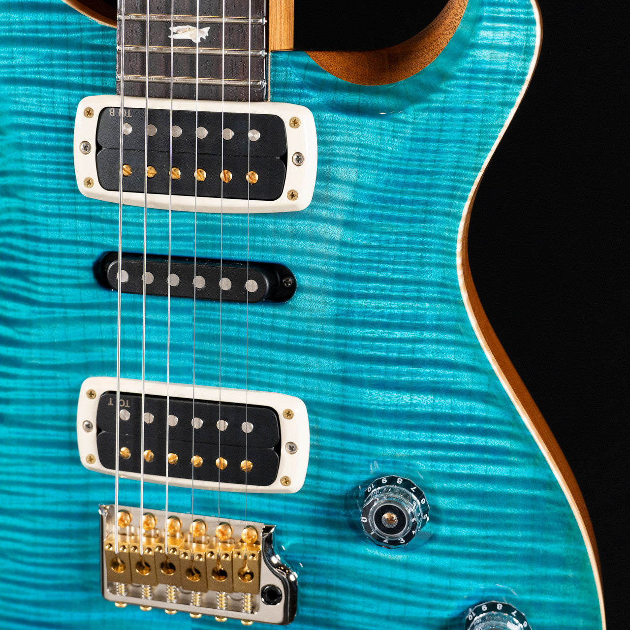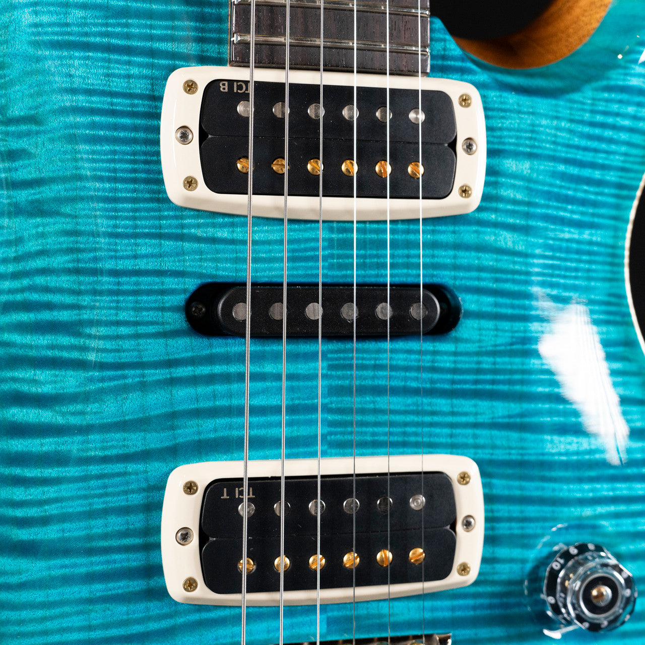 We finally have another beautiful PRS Modern Eagle V Carroll Blue 10-Top electric guitar. The Modern Eagle V guitar is truly a work of art, crafted with a mahogany body and a stunning carved figured maple top, a mahogany neck with the "Pattern" neck carve and a gorgeous dark rosewood fingerboard. The Modern Eagle is full of innovative features from the Phase III Locking tuners to the PRS Patented Gen III Trem. Initially this model was only offered at a private stock level but now you can catch this rare bird at a core level! The top on this one looks incredibly 3-D and has a nice tight, even flame. Not to mention the range of tone it produces, there truly is nothing it can't do. We are thrilled to have this guitar in the shop and are absolutely sure it will be a huge source of inspiration in any set of hands. Comes with a hardshell PRS case and certifications.