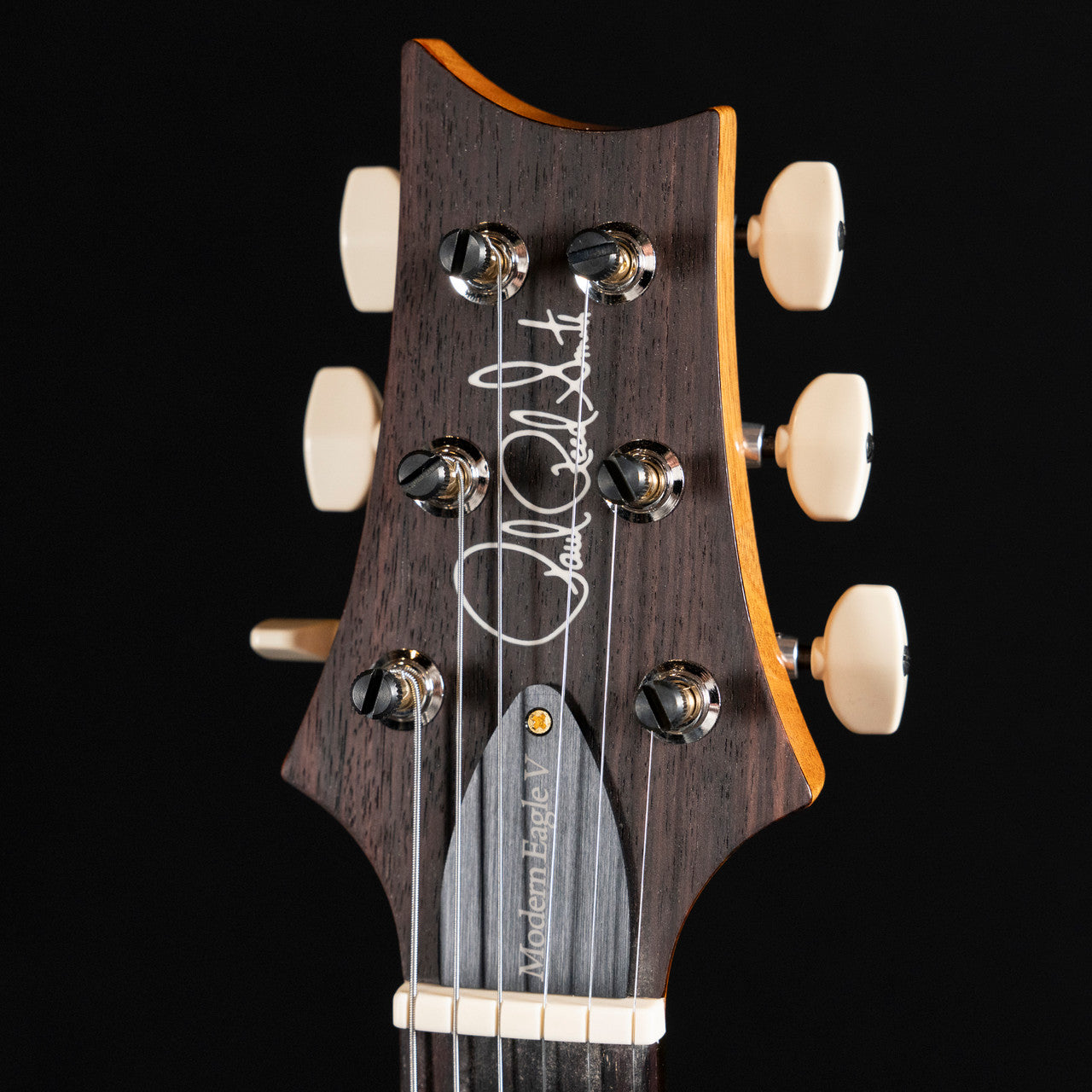 The Modern Eagle V offers highly musical tones for both recording and playing live. A mix of classic and modern, the Modern Eagle V is built on a tried-and-true foundation of a maple top and mahogany back, a 22 fret, 25” scale length, Pattern mahogany neck with rosewood fretboard, bone nut, PRS Phase III Tuners, and the PRS patented Gen III tremolo. Its innovative pickup and electronics configuration puts a wide range of tones at your fingertips.