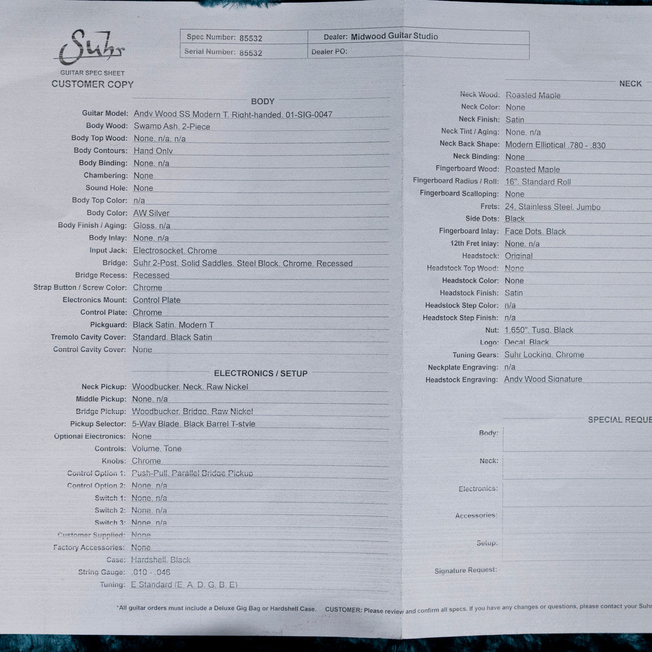 Welcoming in the incredible Suhr Andy Wood Modern T Signature Series -AW Silver electric guitar. Featuring a 2PC swamp ash body, a roasted maple neck and roasted maple fingerboard, a 16" fretboard radius with a set of stainless steel frets, a set of Andy Wood Woodbucker pickups and a sleek AW Silver finish with a satin black pick-guard. It goes without saying that this guitar plays like a dream, the neck specs are ideal for a comfortable and effortless play style. The Woodbucker pickups are crisp, and offer a mean bite with the perfect amount of clarity and ruggedness. This is easily one of our favorite models here at the shop, and this one is SPECTACULAR. Comes with a hardshell case and all of the expected case candy.