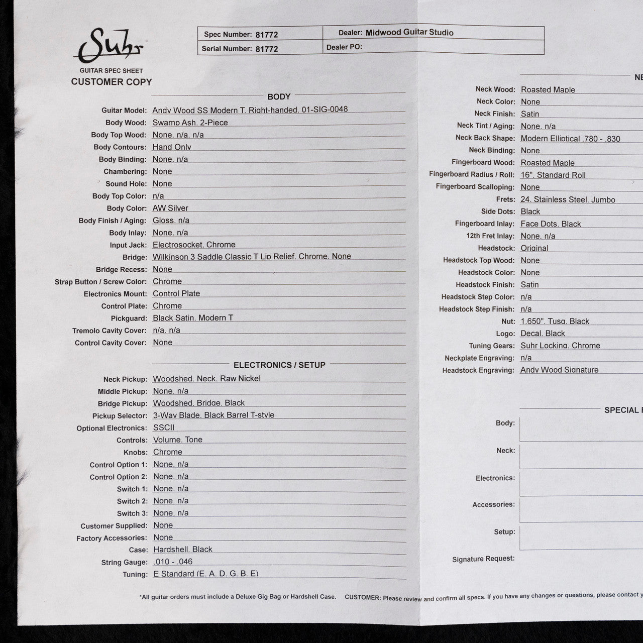 Suhr Andy Wood Signature Series Modern T S/S Electric Guitar - AW Silver