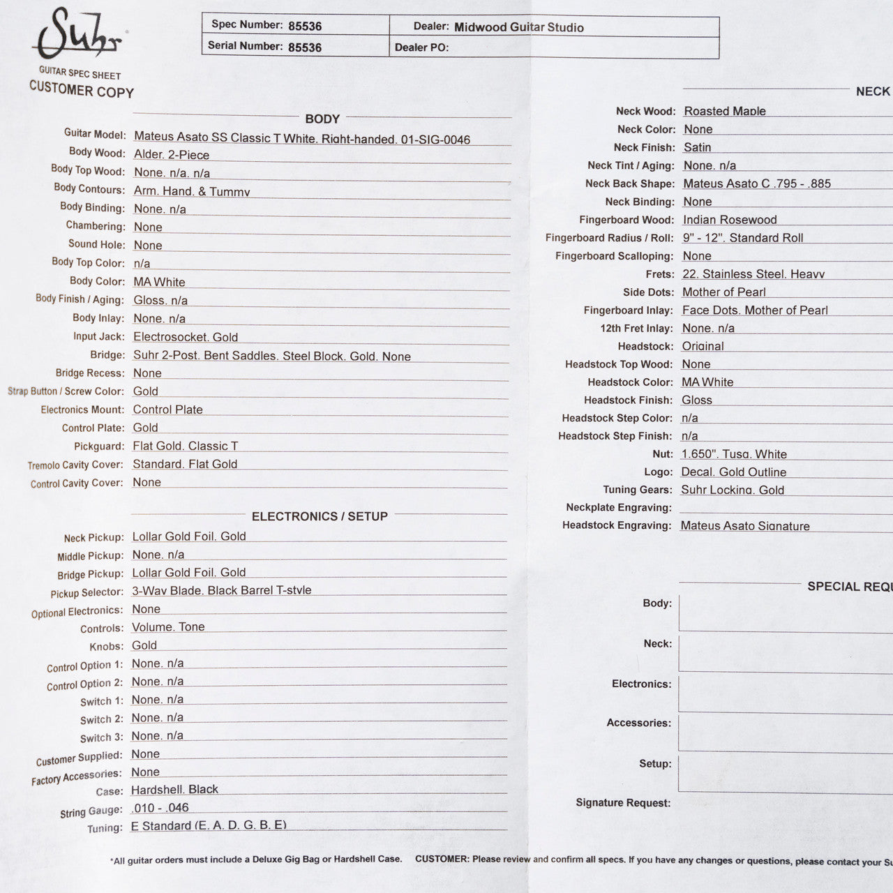 Suhr Mateus Asato Classic T MA White Gloss Finish w/ Lollar Goldfoil Pickups