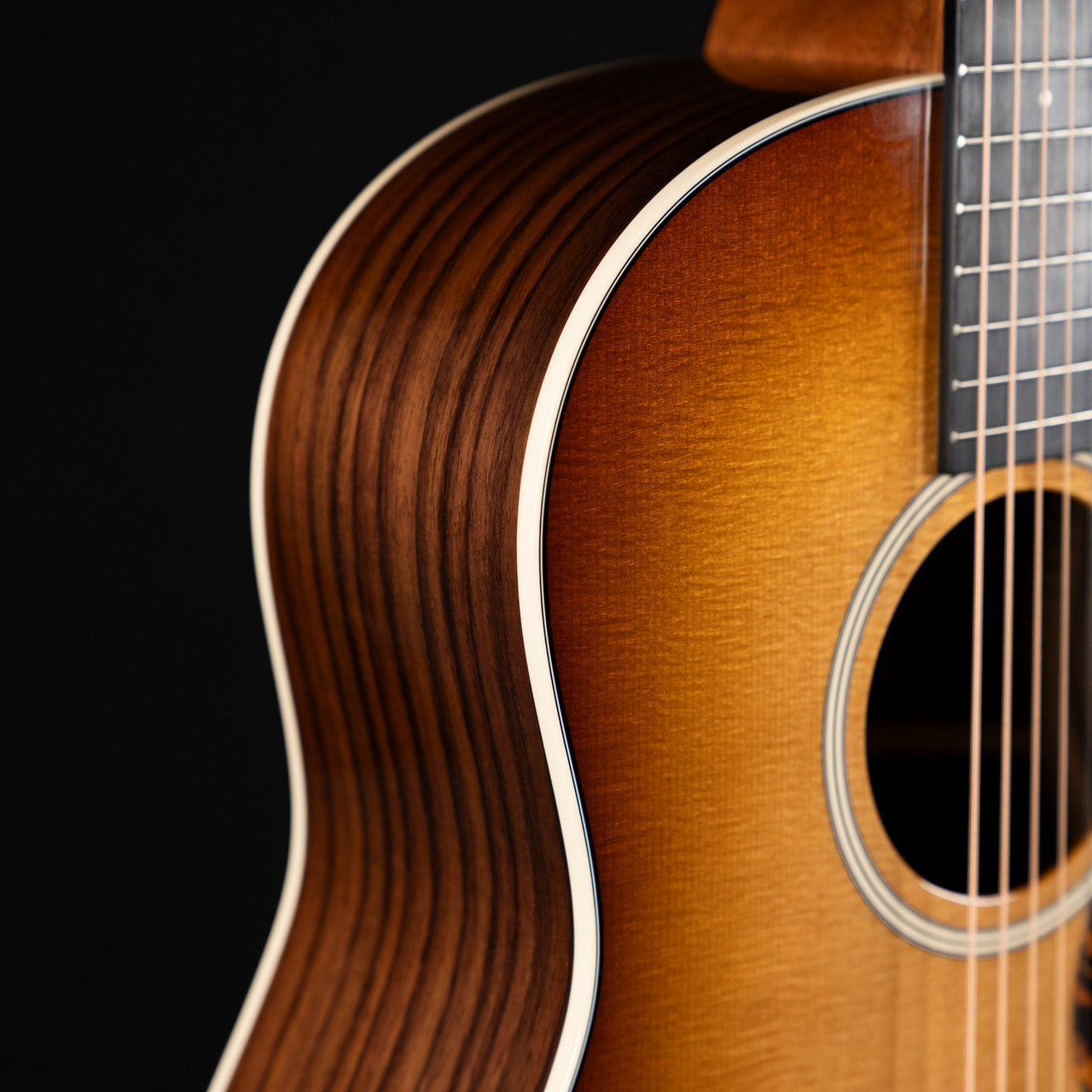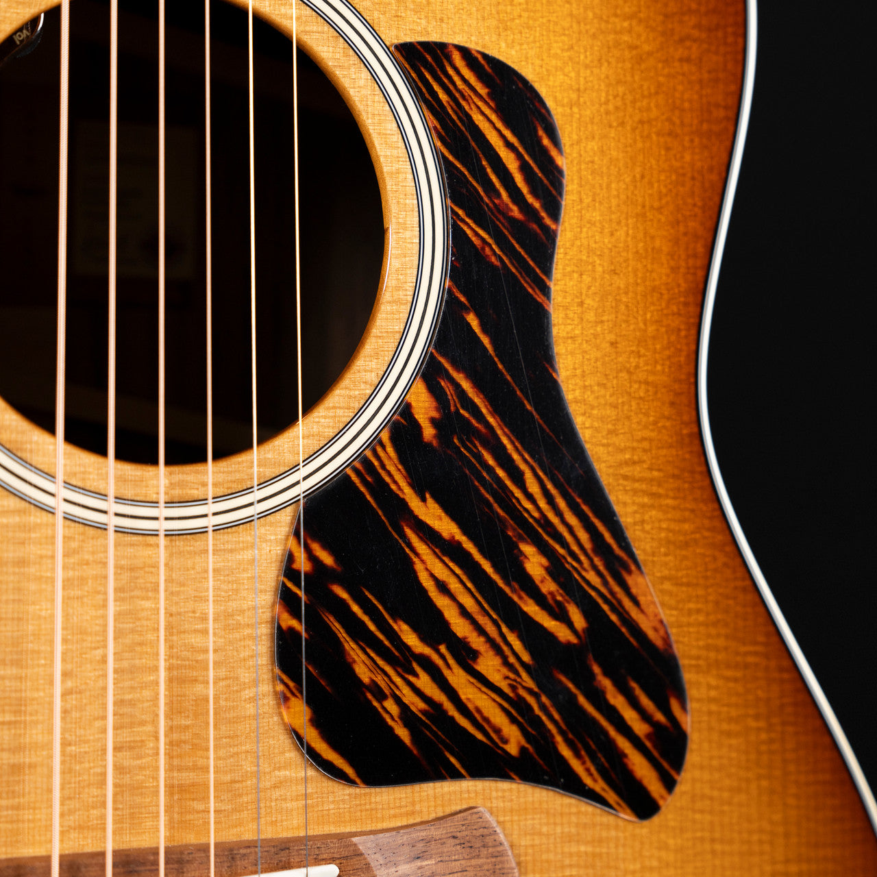 Aesthetic appointments for this model include a golden-brown shaded edgeburst top color treatment to complement a full-body gloss finish, a cream-colored pickguard with matching rosette and binding, Crest inlays, our new Gold Label headstock profile, and a Honduran rosewood Curve Wing bridge with Indian rosewood pins. It ships with LR Baggs Element VTC electronics and a deluxe British Cocoa hardshell case.