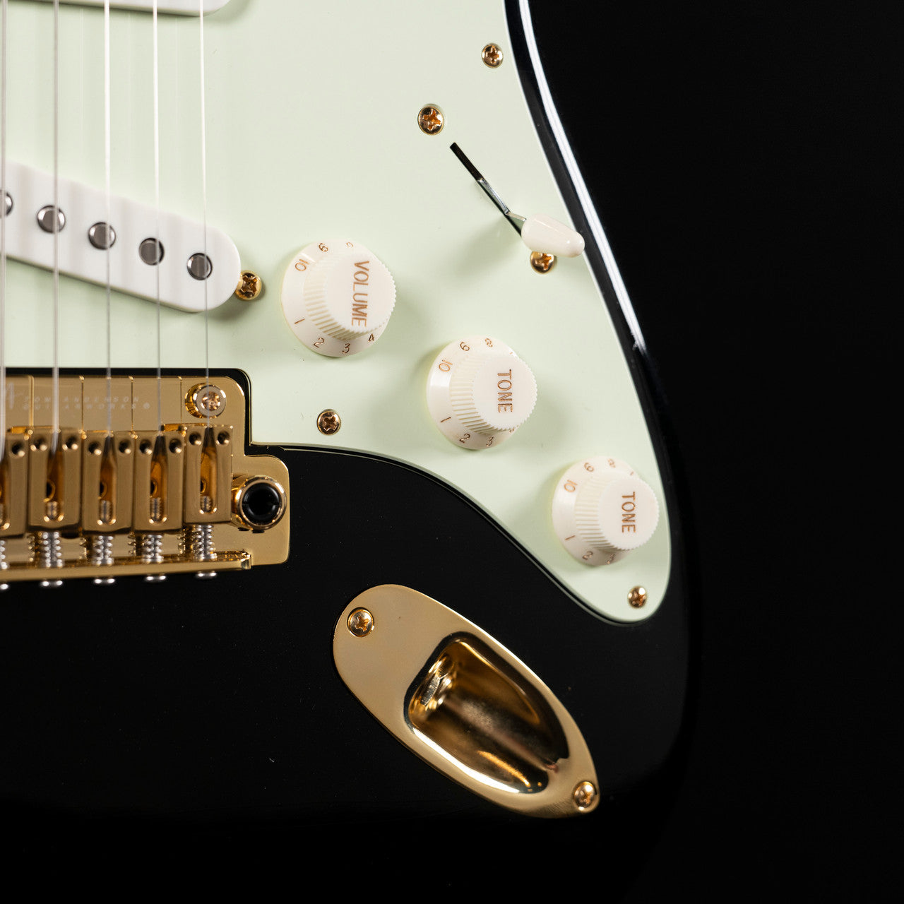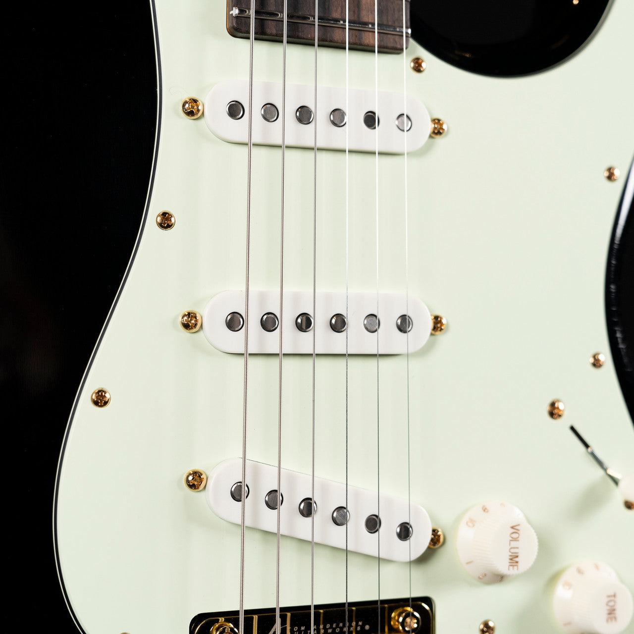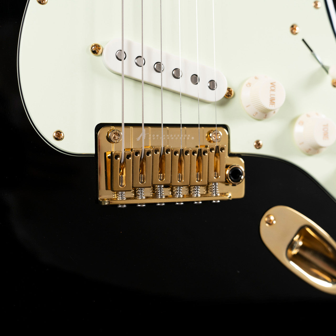 The Tom Anderson Icon Classic blends timeless style with exceptional modern craftsmanship, and this In-Distress Level 1 example in Black is a perfect showcase. The subtle relic finish gives it just the right amount of vintage vibe — lightly aged without going over the top — complemented beautifully by gold hardware and a striking mint green pickguard for a classy yet bold aesthetic. In fact, this particular build is spec’d similarly to a well-known guitar John Mayer used to play, giving it a familiar and iconic look right out of the case.