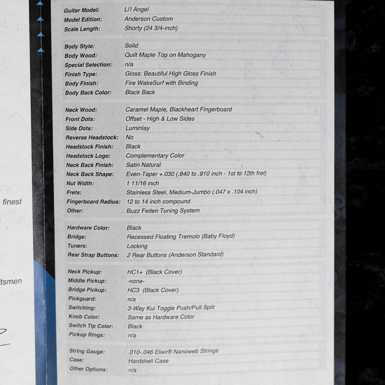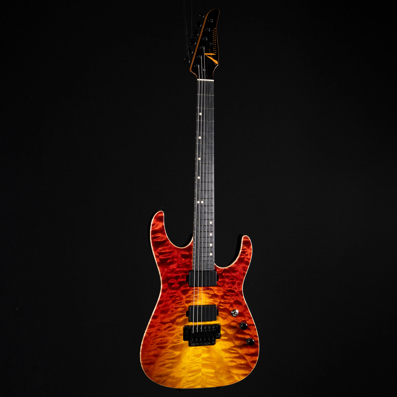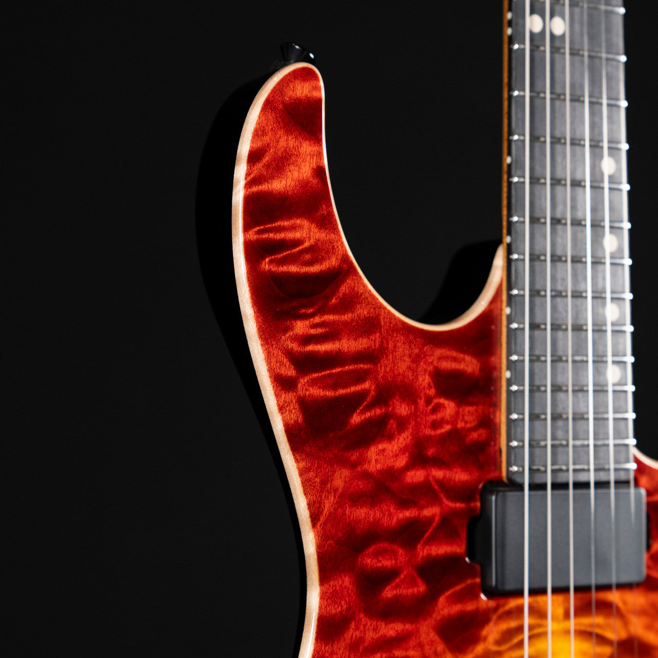 The Tom Anderson Lil Angel in Fire Wakesurf is a breathtaking testament to high-end electric guitar craftsmanship, marrying stunning aesthetics with boutique-level performance. At the heart of its visual allure is a deeply figured quilt maple top—absolutely mesmerizing in its rippling, three-dimensional grain—laid over a rich mahogany body, all brought to life by the fiery, iridescent Fire Wakesurf finish that shifts and shimmers with the light. This show-stopping top is paired with a silky caramel maple neck, perfectly complemented by a rare blackheart fingerboard that adds both visual contrast and tonal depth. Designed with playability in mind, it features a 24.75" scale length for effortless bending, medium jumbo stainless steel frets for longevity and smooth action, and Luminlay side dots that glow in low light—ideal for stage performance. The Lil Angel isn’t just a guitar; it’s a playable piece of art, crafted for those who demand both visual drama and tonal excellence.