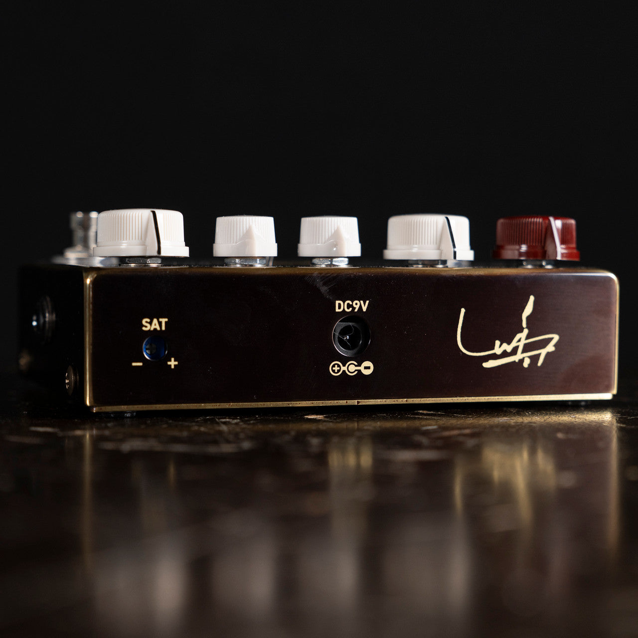 Of the many prototypes created during the year-long development process, there were two prototypes which Char was particularly focusing. The circuits of these two are slightly different but almost similar. However, due to the differences in tuning/tweaking of the components and constants used, the “tone” and “nuances” were very different. Char himself could not decide which prototype was better until the very end. He wanted both sounds in his actual live and gigging situation; as a result, we decided to integrate two sounds/tone into one luxurious unit. The first sound/tone has a vintage tone and feel, while the second channel, the B-channel (bright channel), is brighter, aggressive, and powerful with a punchier attack. Each has its own LEVEL (volume) controls and allows you to go back and forth between the two with the foot switch controls.