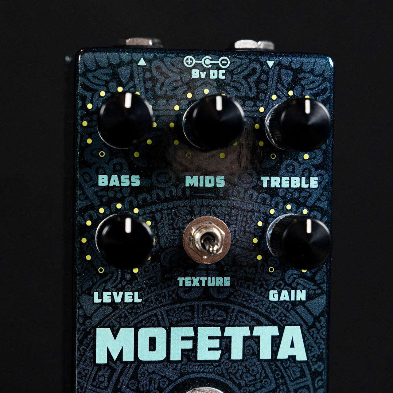 Think of the Mofetta as a supercharged MOSTORTIONtm, reborn and amplified. I made sure that it delivered the classic, amp-like overdrive, massive headroom, and versatile 3-band EQ that made the original so famous. But I also wanted more and added a Texture Switch that introduces actual MOSFETs into the pedal's overdrive section for a bolder, more articulate tone. The Mofetta preserves everything you love about the early '90s legend with a powerful new dimension.
