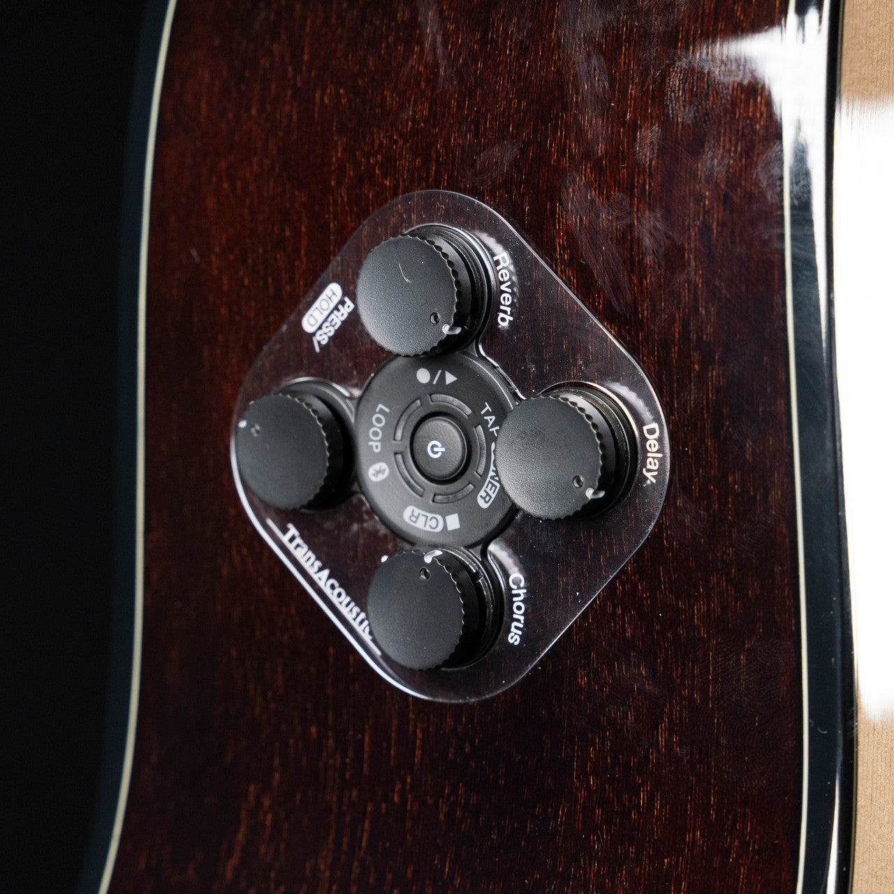 As the second-generation model of the TransAcoustic Guitar line, the TAG3 C features the next evolution of the original TransAcoustic Guitar features. The cutaway dreadnought body is well-suited to powerful strokes and features a solid Sitka spruce top and a solid mahogany back and sides. With an extra, newly improved actuator (two total), the guitars also offer even higher-quality effects, along with built-in looper functionality. A new Delay effect has been added to the original Reverb and Chorus, for a total of three available effects. Looper functionality stimulates creativity by giving players the ability to record their own sound and play it back in a loop, allowing them to layer phrases while playing. Players can use the TAG Remote app to adjust the output of these effects. New Bluetooth® audio capability also lets the user connect a smart device and play audio through the guitar body. The TAG3 C is an all-in-one instrument that covers the full breadth of the musical creative process: listening, playing, and creating.